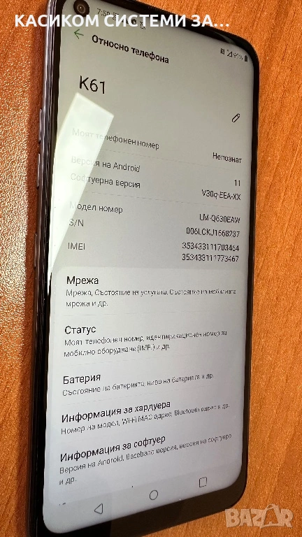 Смартфонът LG K61 работи на операционна система Android . Телефонът се захранва от ядро Octa, 2.3 GHz, процесор Cortex A53. Работи на чипсет MediaTek Helio P35. Разполага с 4 GB RAM и 64 GB вътрешна памет. LG е с размери 164,5 мм х 77,5 мм х 8,4 мм . Екранът е с резолюция 1080 x 2340 пиксела и плътност на пикселите от 396 ppi.