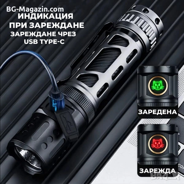 🚀 Бързо зареждане през USB-C: Забравете за досадното вадене на батерии. Този Мощен ръчен фенер YEMAO разполага с вграден USB Type-C порт, който позволява бързо и лесно зареждане директно в корпуса – в колата, от лаптоп или външна батерия. 🔋