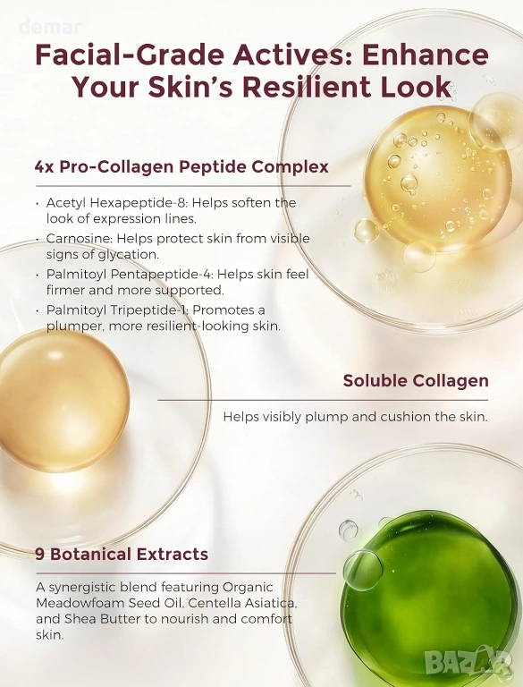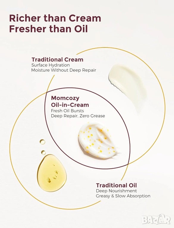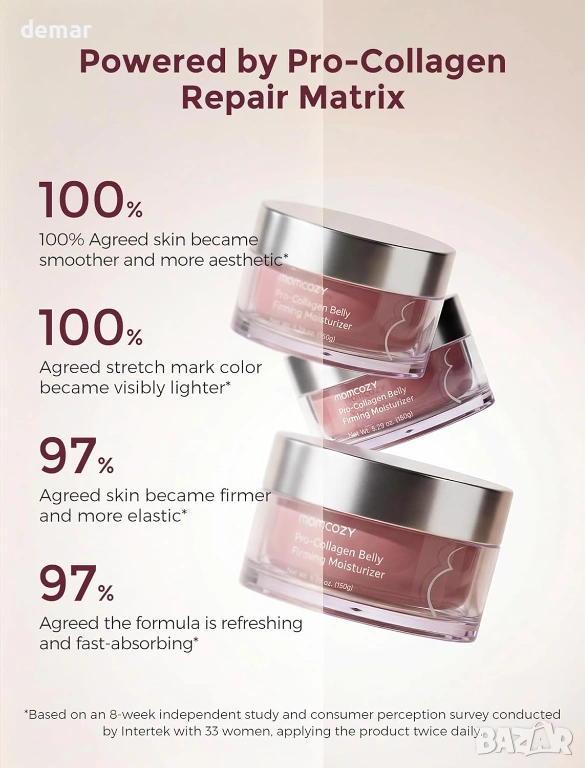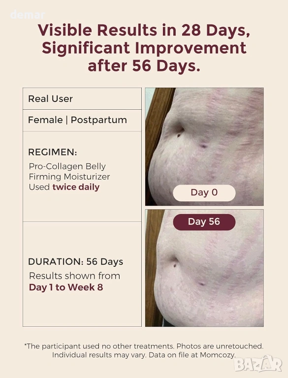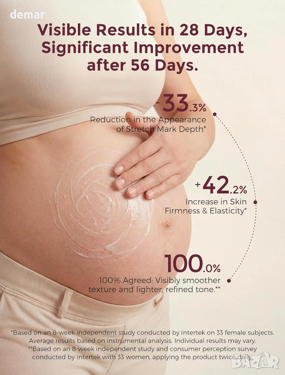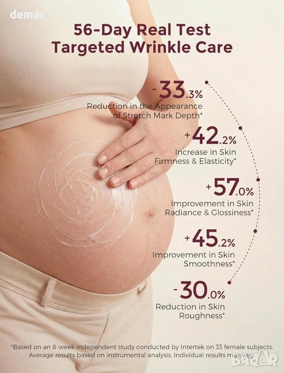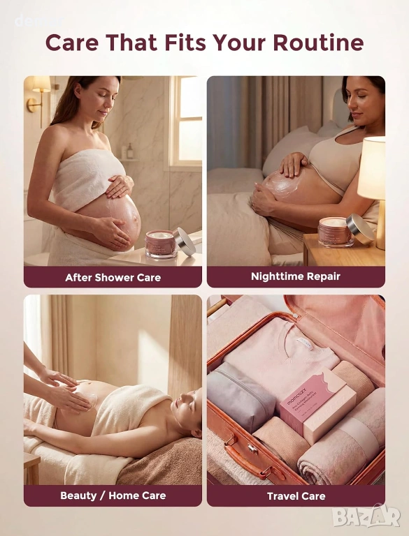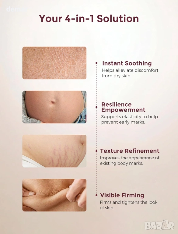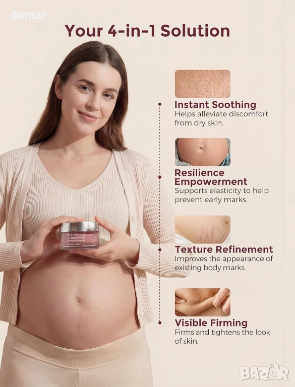 Хидратиращ крем за бременни с качество за лице, формулиран с 4x про-колагенов пептиден комплекс, разтворим колаген и девет богати на хранителни вещества растителни екстракта за дълбока хидратация, подобряване на еластичността на кожата и поддържане на по-стегнат и гладък вид на корема. С иновативна технология „масло в крем“, която освобождава подхранващи вещества при нанасяне за бързо абсорбиране без мазни остатъци. Клинично доказано, че подобрява текстурата на кожата в рамките на 4 седмици, намалява появата на стрии и повишава стегнатостта и еластичността с течение на времето. Предназначен за всички етапи на бременността и следродилна грижа, помага за успокояване на сухотата, поддържа разтегната кожа, изглажда съществуващите стрии и стяга отпуснатите зони, като същевременно е нежен, тестван за безопасност и подходящ за чувствителна кожа.