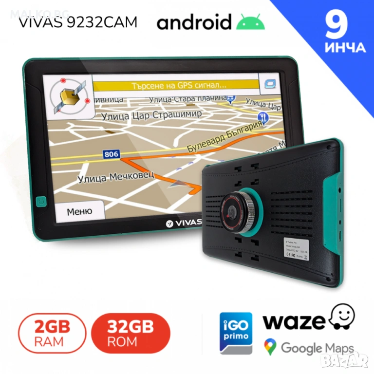 Ново! Нов модел мощна GPS навигация с Android 13 с 32GB памет, 2GB RAM, Висококачествен HD екран, Видеорегистратор, Android Auto, CarPlay и Mirror screen. Възможност да използвате едновременно на едно устройство - IGO Primo, Google Maps, Waze, Youtube, Spotify и още безброй приложения. Навигацията има WiFi интернет връзка и всички функции на таблет, включително достъп до Google Play магазин за изтегляне на приложения и игри. Навигационната програма е с карти за цяла Европа за автомобил, камион, автобус, велосипед и туризъм. Навигацията Vivas Android 9232 Cam EU не се нуждае от интернет връзка. Менюто и навигационната програма са изцяло на Български език. Освен Български език, на разположение са и много други езици. Vivas Android 9232 Cam EU e oборудванa с най-съвременен 9" дисплей с отлична видимост при пряка слънчева светлина, широк зрителен ъгъл и цветопредаване, интегрирана памет от 32GB, свободен слот за microSD карта с капацитет до 32 GB, вход за камера за заден ход и паркинг , WiFi и Bluetooth връзка, FM предавател, преглед на снимки (фото рамка), музикален плеър, видео плеър, имейл клиент, календар, мощен високоговорител , изход за слушалки. Vivas 9232 Cam EU идва в комплект със зарядно устройство за автомобил (12-30V). С интернет връзка и Google Play можете да изтеглите още приложения, за да разширите функционалността на устройството си с допълнителни функции, като четец на електронни книги, да преглеждате и редактирате файлове на Office, като Word, Excel и PDF файлове. И разбира се много различни игри и хиляди други приложения