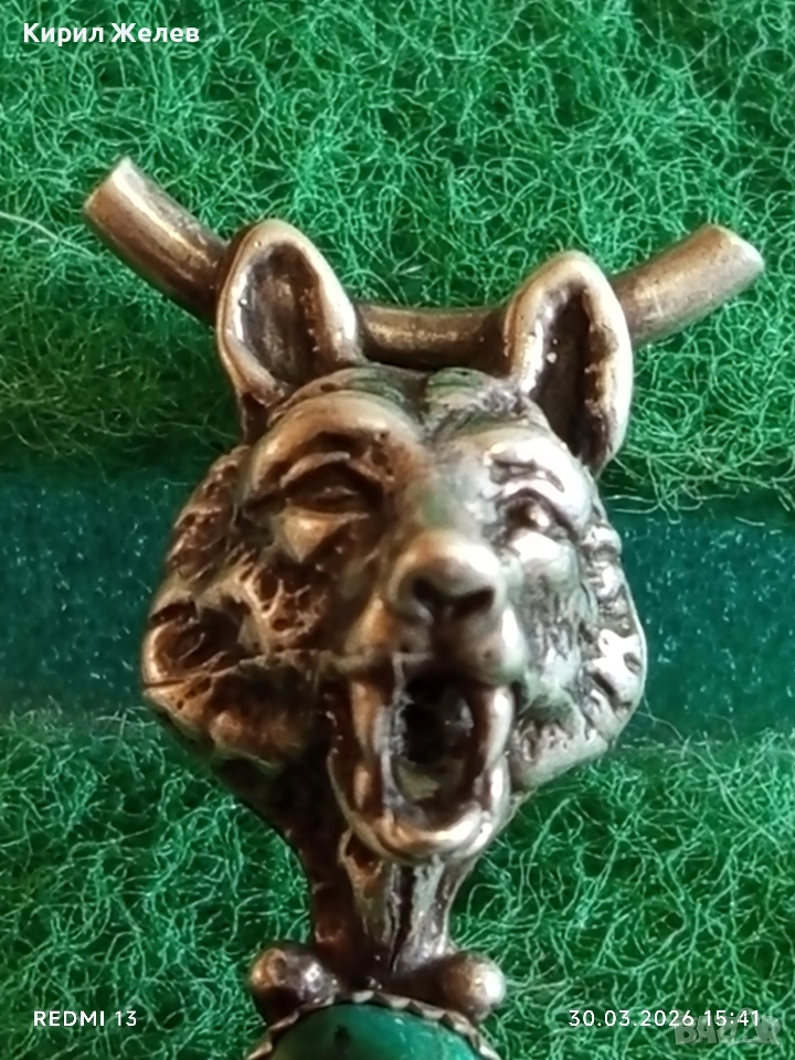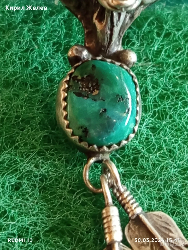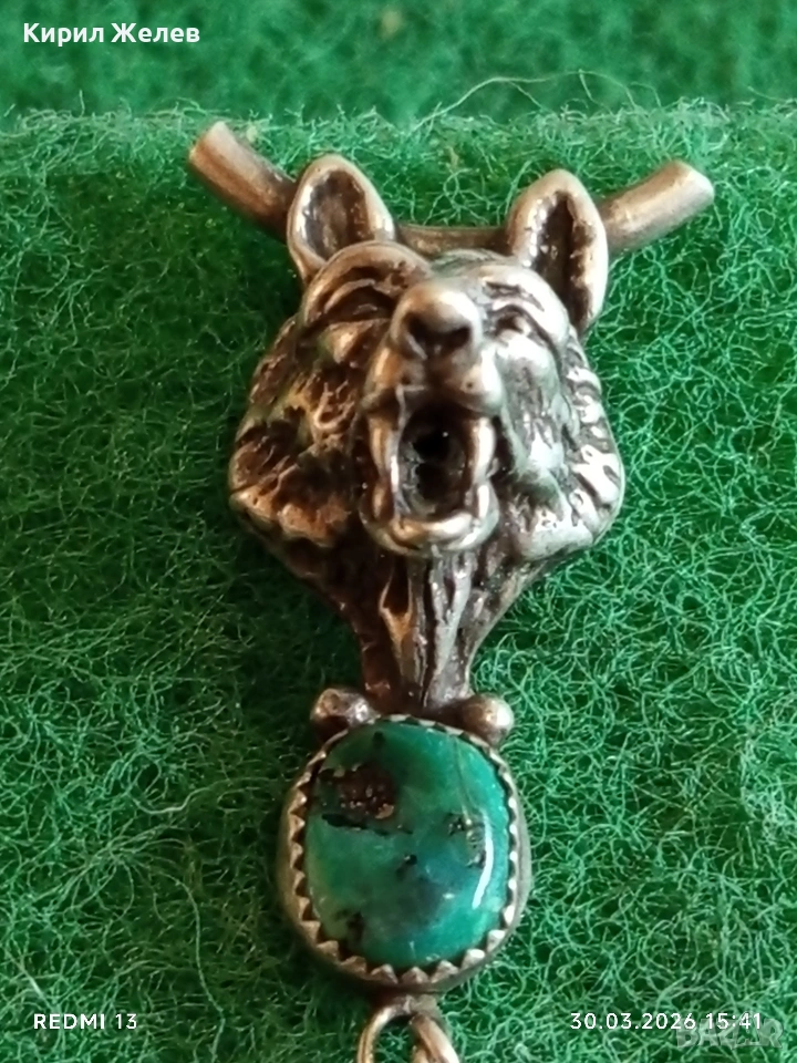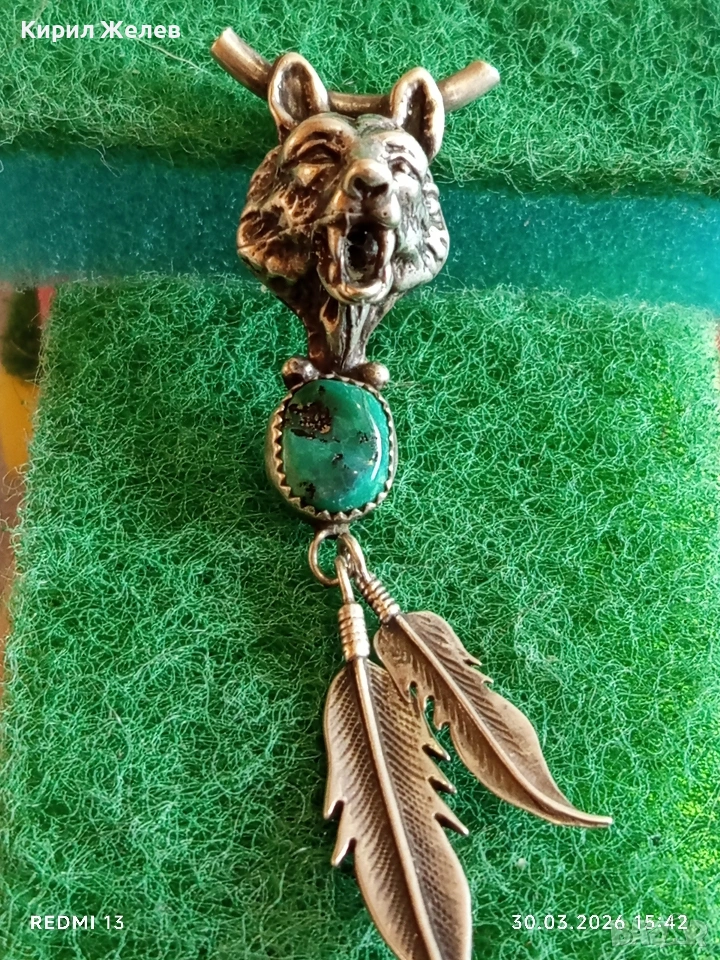 Сребърен медальон с Вълча глава , тюркоаз и висящи пера Индиански стил 54205