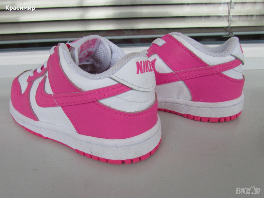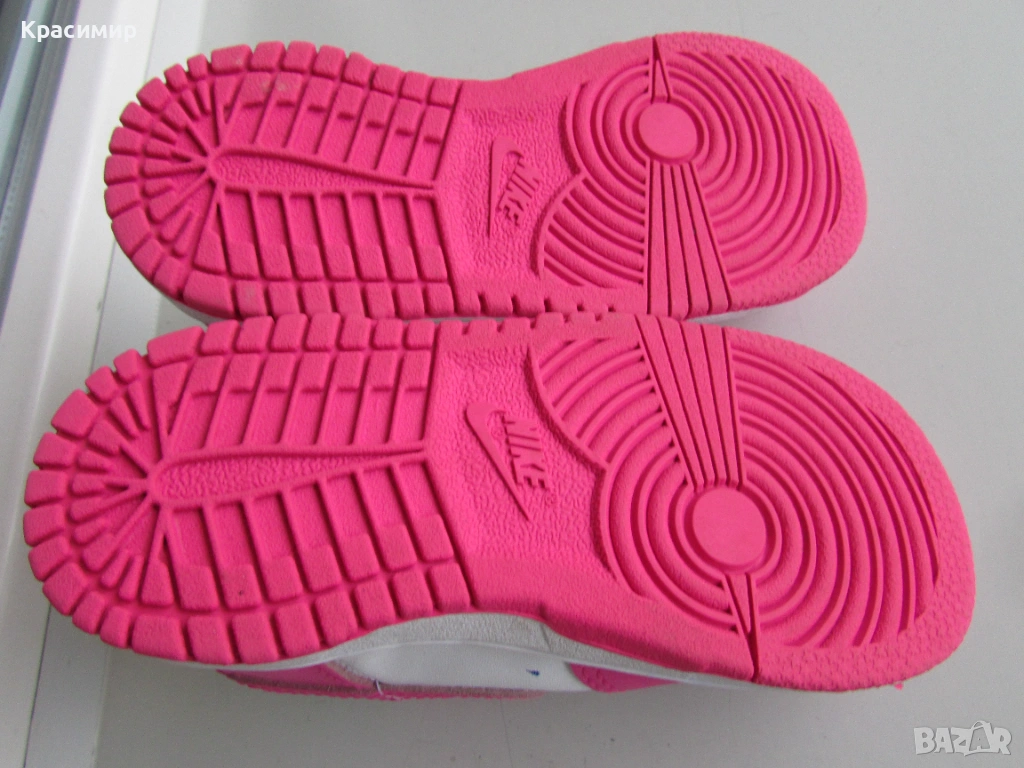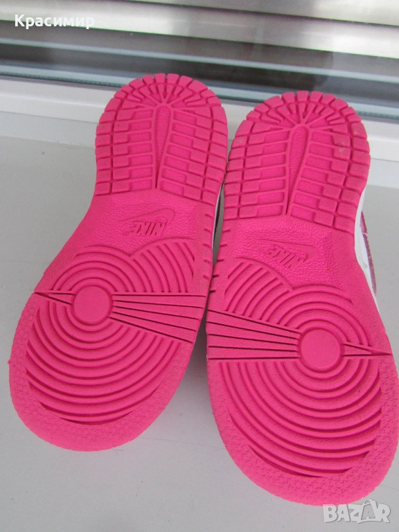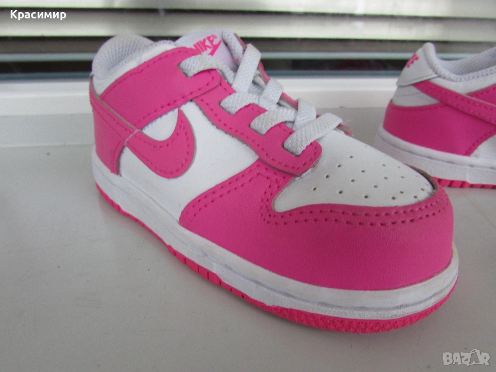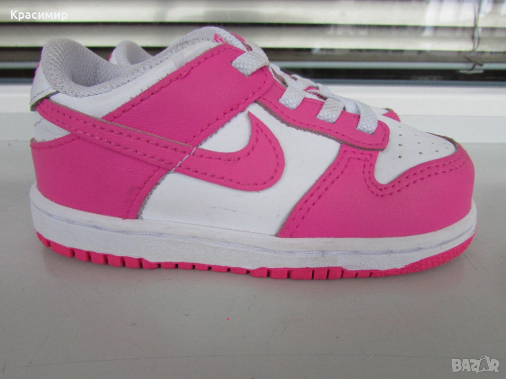 Детски маратонки Nike Dunk Low 'Laser Fuchsia', изработени от естествена и изкуствена кожа в горната част. Връзките са еластични за лесно обуване и събуване, с подплатена яка за удобно прилягане, а междинната подметка от пяна абсорбират ударите. Имат гумена издръжлива подметка за добро сцепление, като по цялата дължина подметката е шита за повече стабилност. Номер 25 с дължина на стелката 15 см. Произведени във Виетнам. Маратонките са в перфектно състояние.