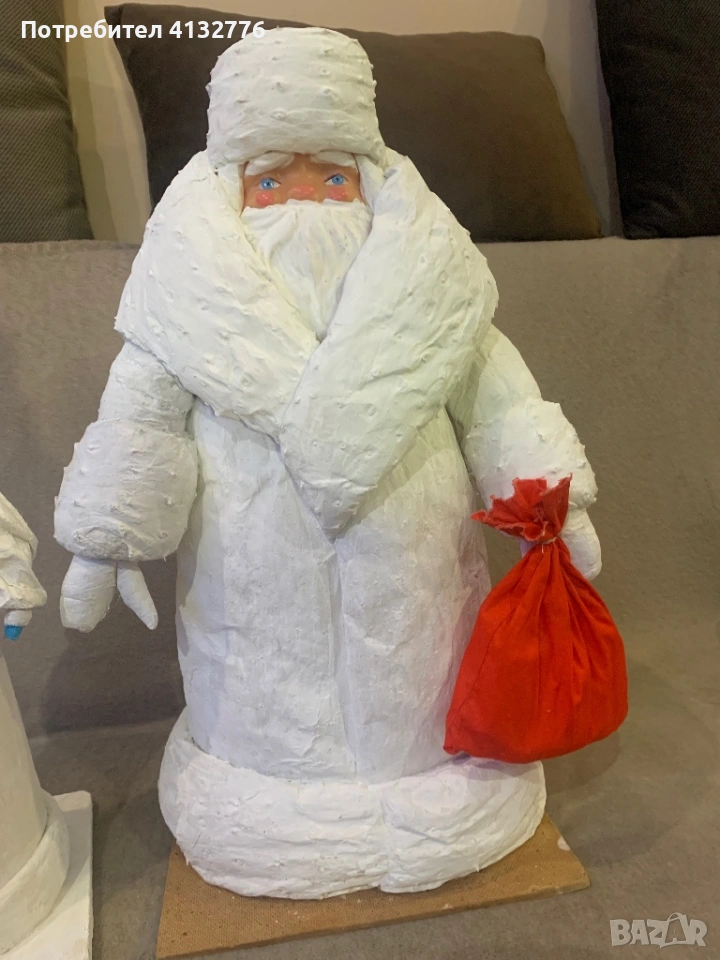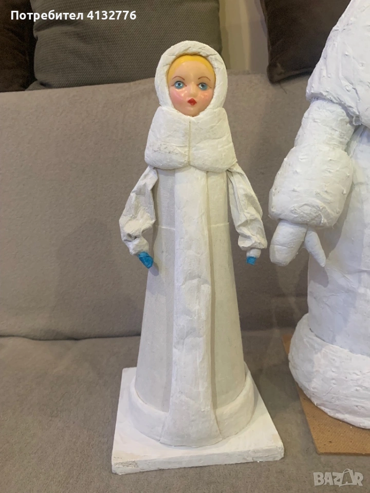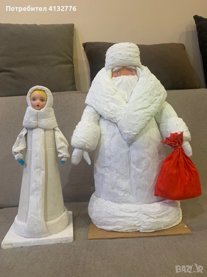 Фигурките са подставъчни елхови играчки, типични за съветския период, и са изработени по традиционна технология от вата, папие-маше и хартия. Лицата са ръчно рисувани, което придава уникален характер на всяка фигура. Дядо Коледа е облечен в бяла шуба и държи червен чувал с подаръци, а Снежанка е в елегантно дълго бяло облекло.