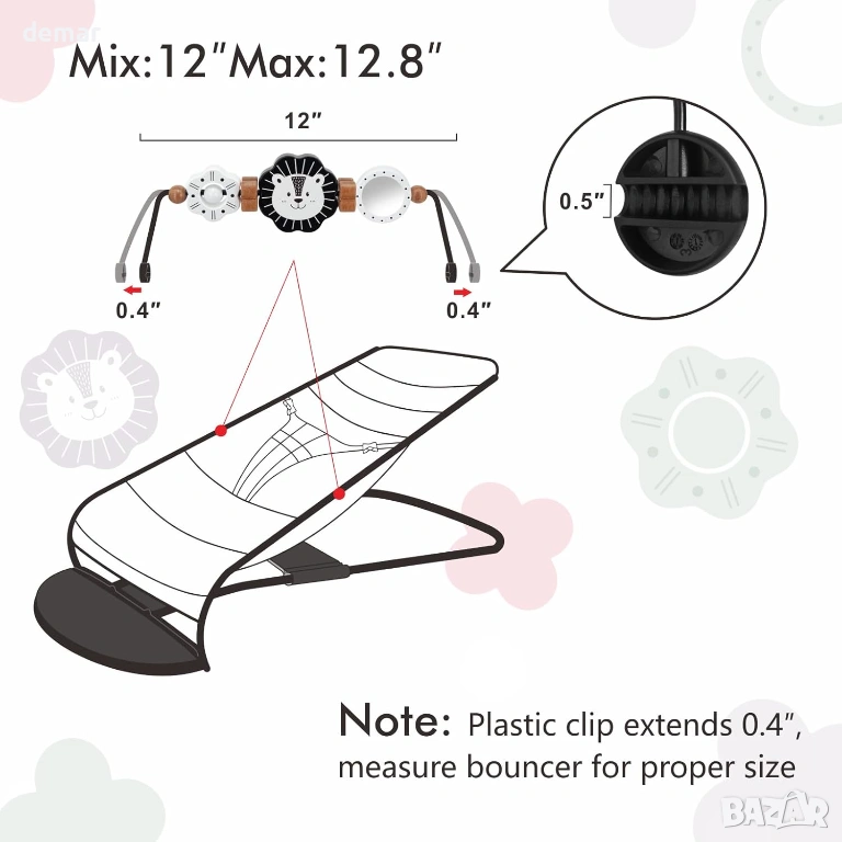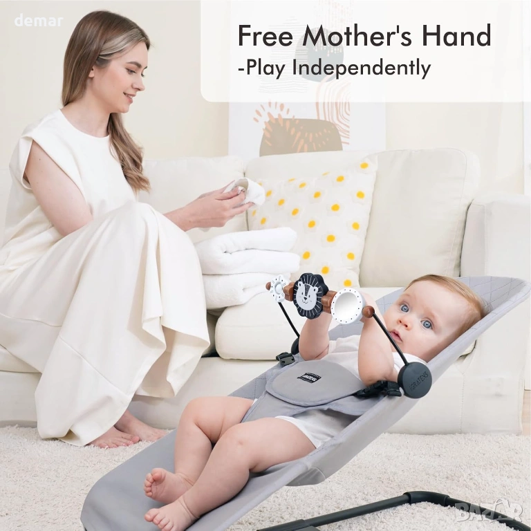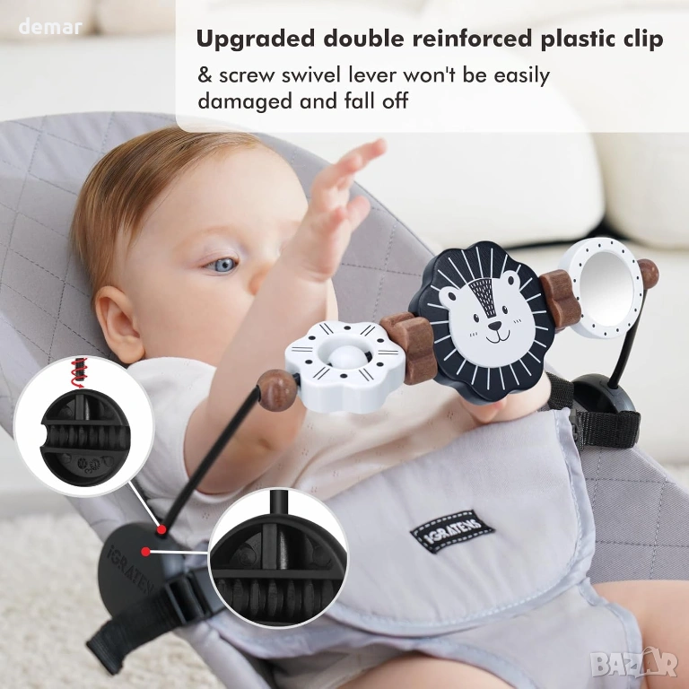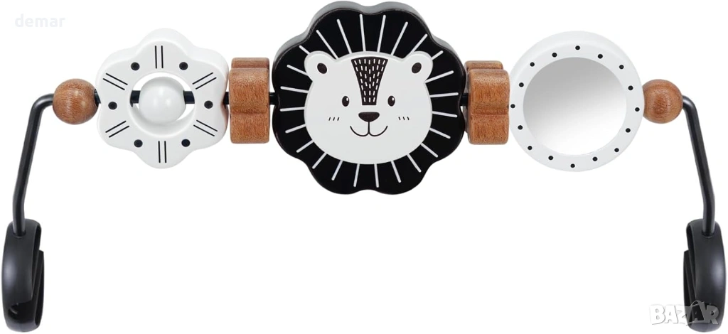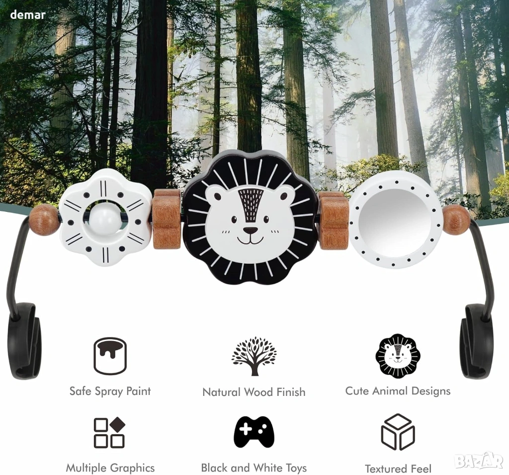 Черно-бяла бебешка играчка за шезлонг с животинска тематика, предназначена да подпомогне ранното зрително и когнитивно развитие при бебета на възраст 0–6 месеца, с висококонтрастни шарки, които подобряват фокуса и разпознаването. Включва ангажиращи елементи като търкалящи се мъниста, плоски форми, въртящи се дървени парчета и сигурно вградено огледало, което насърчава себепознанието и любопитството. Изработена от естествена букова дървесина с нетоксична боя без мирис за безопасно, издръжливо и тактилно изживяване при игра, като се избягват пластмасови материали. Съвместима с шезлонги Bliss and Balance Soft, както и с други модели с ширина 30–32 см. Осигурява мултисензорна стимулация чрез подобряване на концентрацията, разпознаването на цветове и форми и цялостното развитие на мозъка, като същевременно остава безопасна за никнене на зъби и забавлява бебетата.