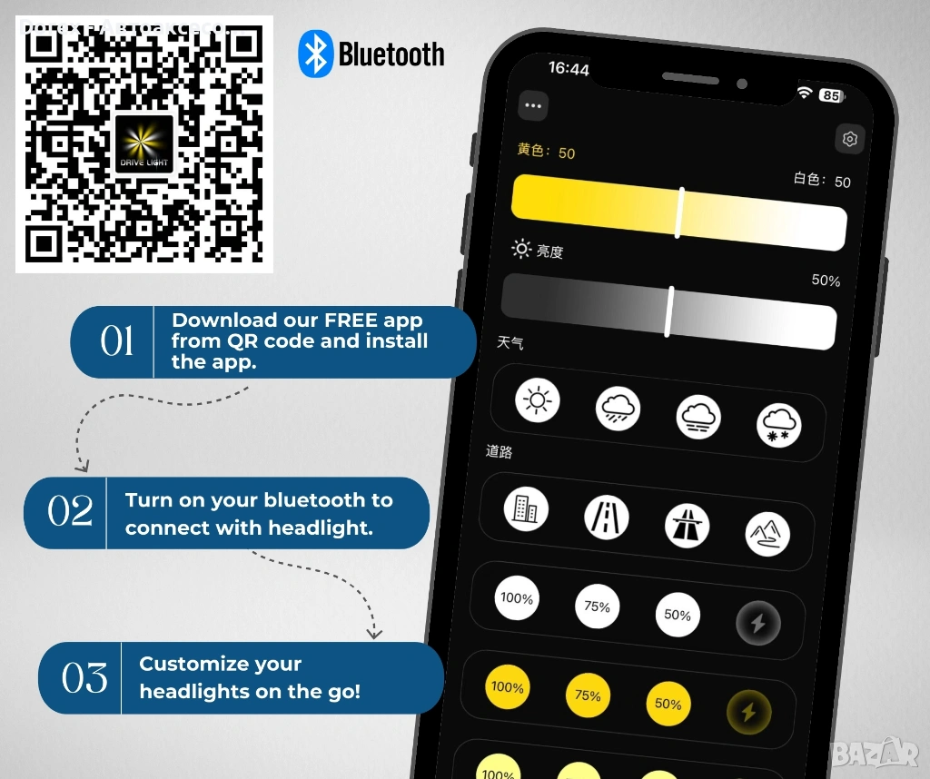 Настройвайте светлината лесно през приложение според условията на пътя: