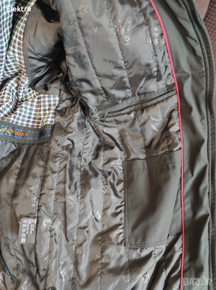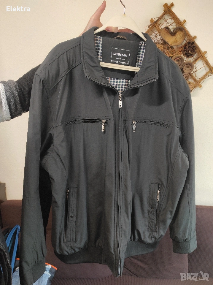 Мъжко черно яке, средна дебелина (пролет/есен). По етикет е номер 66, подходящо за голям мъж. Има множество джобове - вън и вътре (вижте на снимките). Една забележка - на единия ръкав е леко закачено някъде (има снимка).