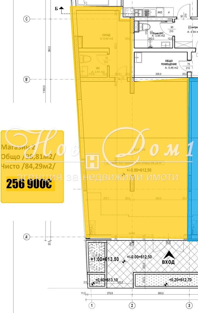 Предлага се Офис/Магазин, подходящ за Вашата бизнес идея! Застроена площ 84м2, с общи части 99м2. Състои се от голяма зала, Склад, Тоалетна. Изложение Североизток!