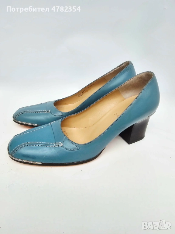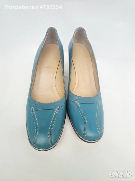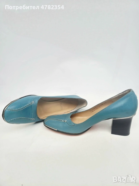 Продавам обувки, модел Talasea на швейцарската марка Bally. Те представляват винтидж дамски обувки тип „pumps“ (затворени обувки на ток), изработени от синя естествена кожа. Отлично състояние, необувани. Красив светлосин цвят с кремава вътрешна част и оранжеви подметки. Декоративни контрастни шевове в предната част. Мека естествена кожа с маслен оттенък, със сребристи метални детайли, токчета с тъмно дървено покритие. Вътрешната страна е маркирана с „Talasea, Made in Italy 12/00“. Висок ток 6,35 см.