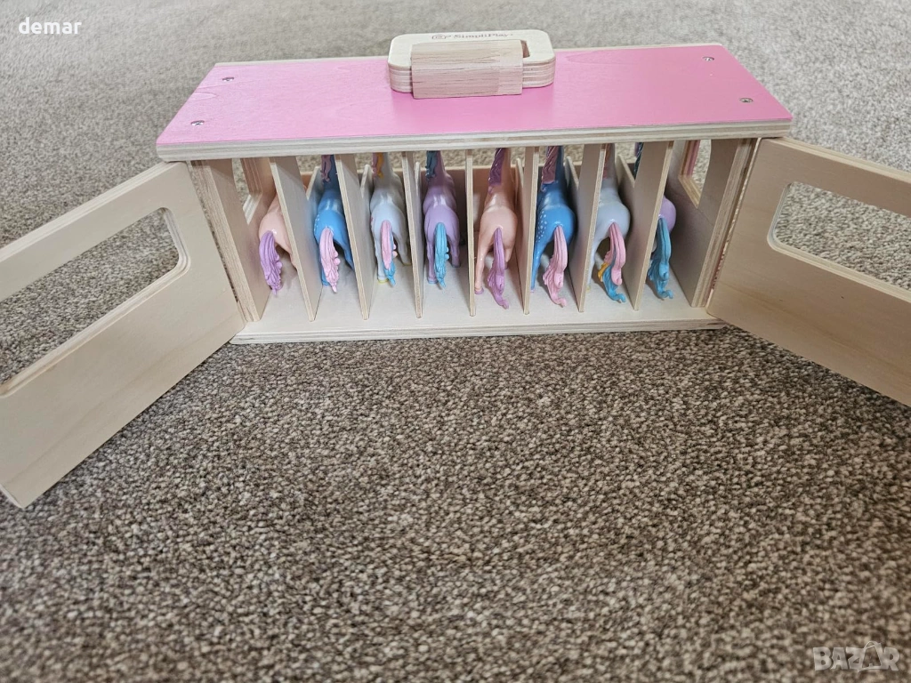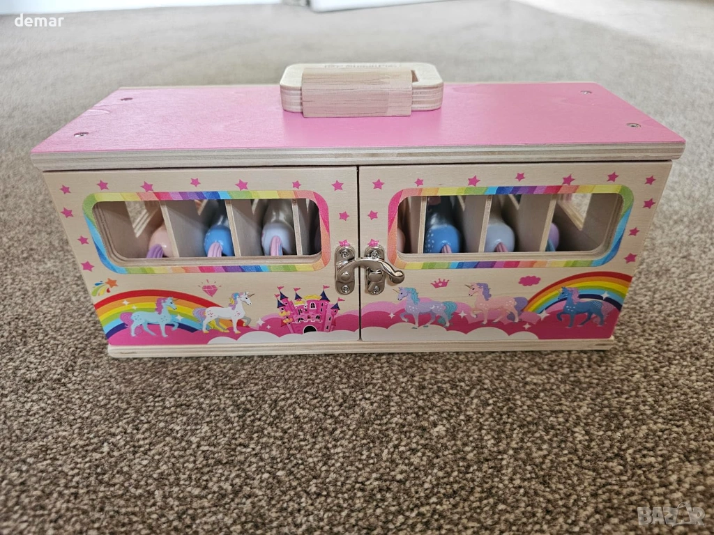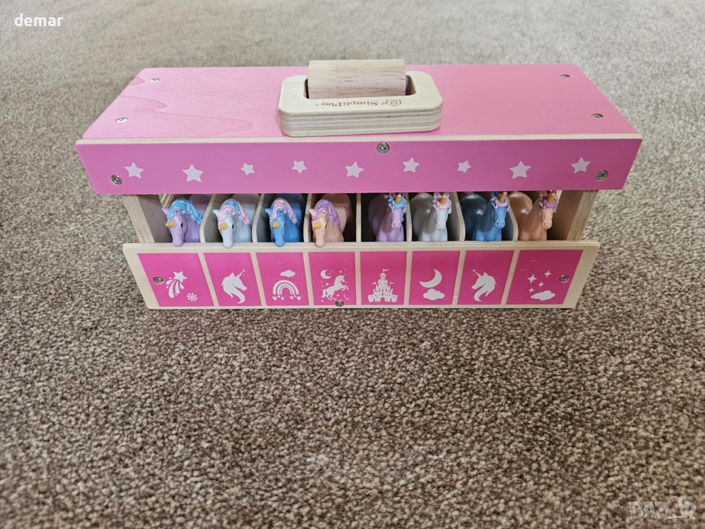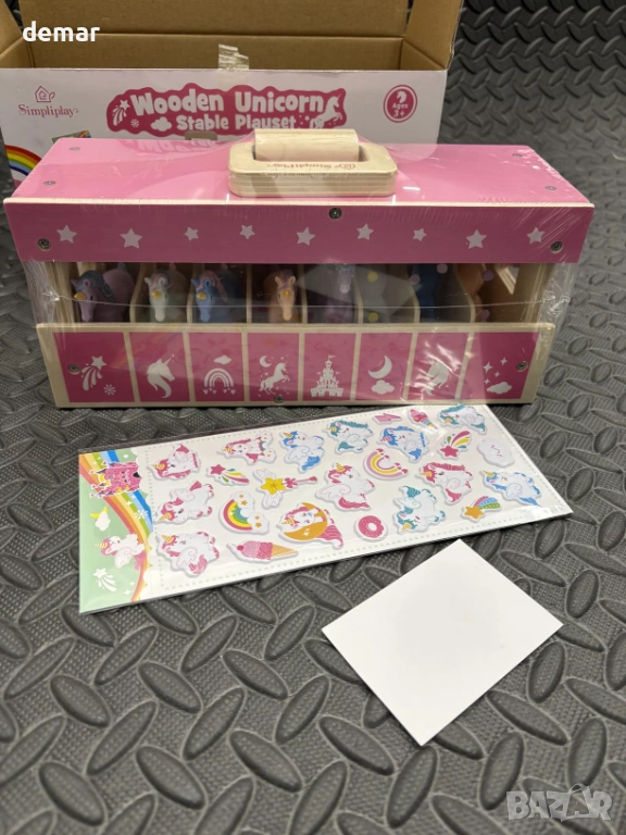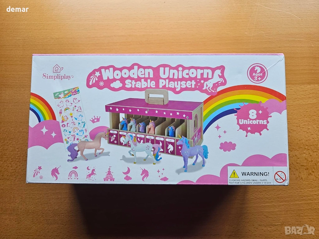 Дървен комплект за игра с конюшня, включващ сгъваема конюшня с лесни за употреба метални ключалки и 8 цветни фигурки на еднорози, което насърчава ученето и разпознаването. Проектиран за преносимост със сгъваема конструкция, която не изисква сглобяване, което го прави удобен за пътуване и съхранение. Изработен от издръжлива дървесина с гладки ръбове и съчетан с нетоксични пластмасови фигурки за безопасна и дълготрайна употреба. Включва стикери с имена за допълнителна персонализация, позволяващи на децата да етикетират и се грижат за собствените си еднорози, докато участват в въображаема ролева игра, която подкрепя креативността и разказването на истории. Подходящ за деца над 3 години, предлагащ ангажираща игра без екран и го прави привлекателен вариант за подарък за различни поводи.