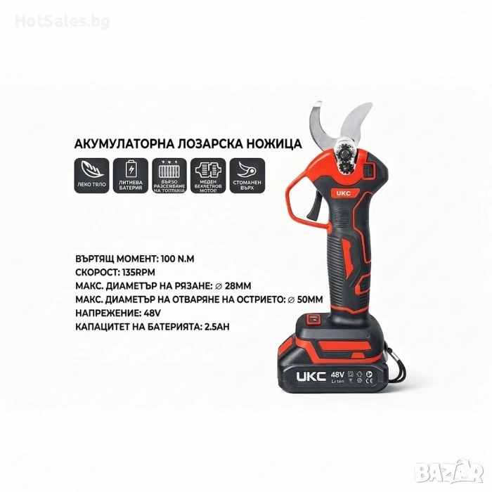 - Акумулаторна лозарска ножица UKC 48V 8500;