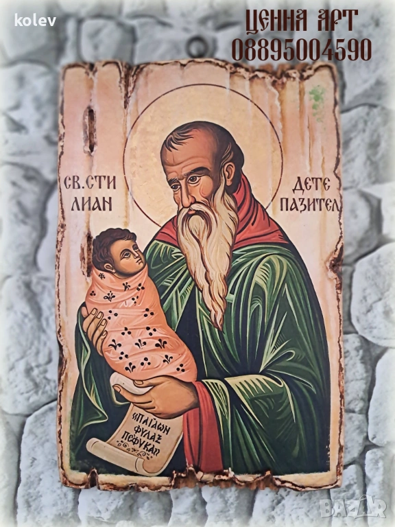 Икона на Свети Стилиян Пафлагонски Детепазител 30/20см, художествен декупаж