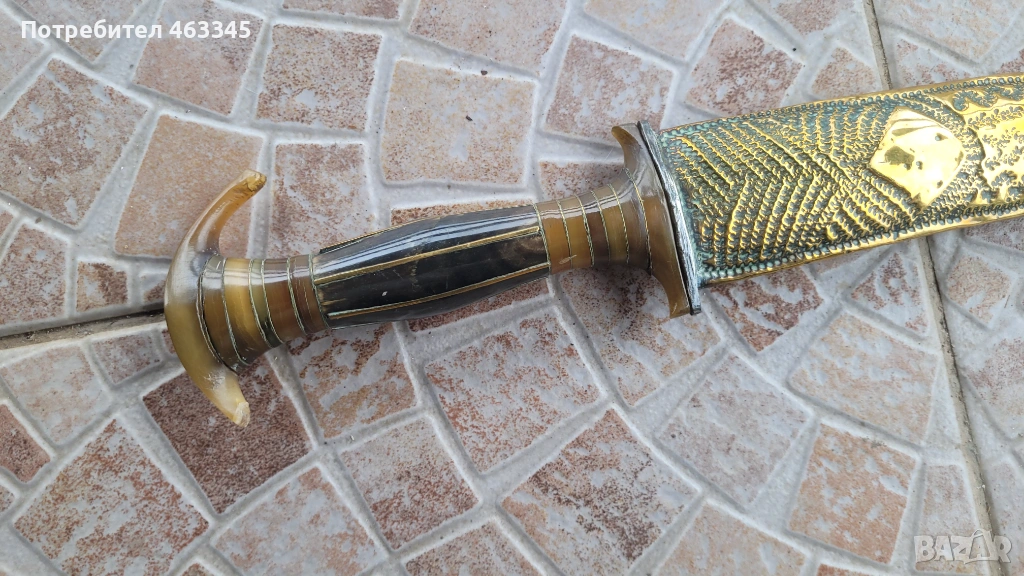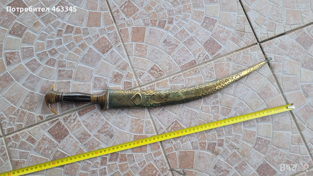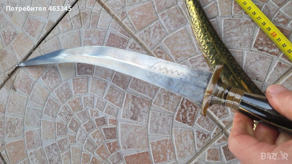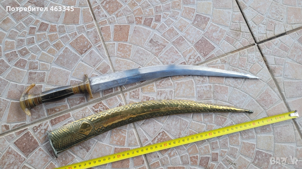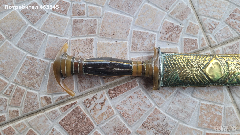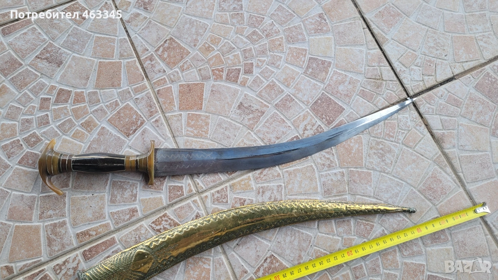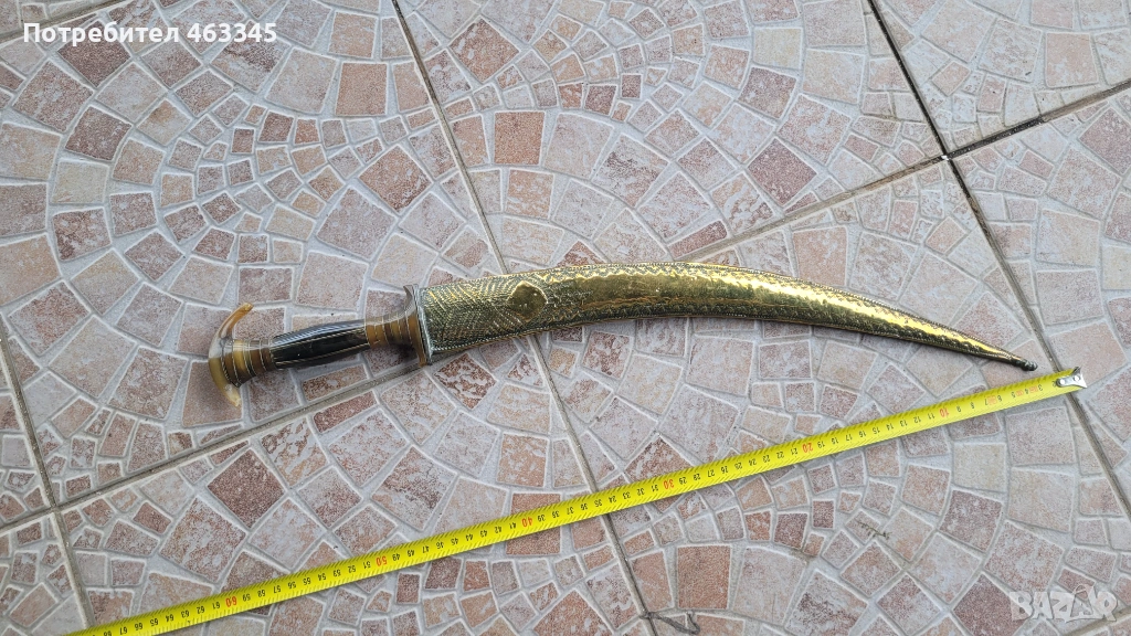 Стара, къса, арабска сабя. Пускам я в продажба отново, понеже гъркът, която я спечели, дори не отиде до офиса на Еконт да си я вземе, нито ми отговори на обажданията. Сабята е в отлично състояние. всичко се вижда от снимките. Рогова дръжка, богато украсена, Острието е без ръжда, украсено в основата и от двете страни. Ножната е облечена с месингова ламарина, украсена богато с гравюри
