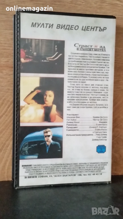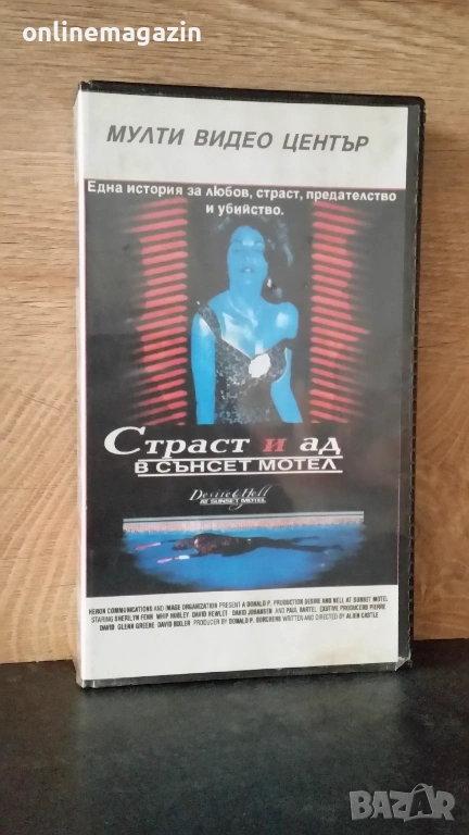 Продавам оригинална видеокасета на МУЛТИ ВИДЕО ЦЕНТЪР " Страст и ад в сънсет мотел " Криминална-драма от 1991 година. Касетата и кутията са много запазени . Филмът работи отлично и е озвучен на български език . Времетраене 90 минути ( 1 час и 30 минути ) . Изпращам с Еконт, Спиди или лично предаване.