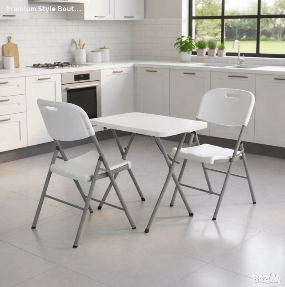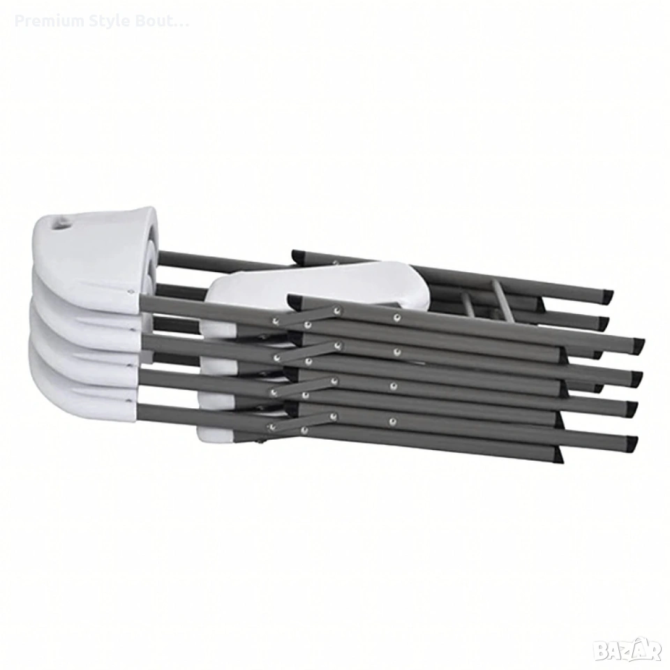 Материал: HDPE (пластмаса) за седалка и облегалка, електростатично боядисана стомана за рамка; Цвят: Бял за седалката и облегалката, сив за рамката; Размери: Височина: 82 см; Ширина: 44,5 см; Дълбочина: 58см; Дълбочина на седалката: 40 см; Приложение: Подходящи за вътрешна и външна употреба; Особености: Сгъваеми столове, дръжка за носене, лесни за съхранение и транспортиране; Устойчивост: Висока устойчивост на атмосферни условия и повреди.