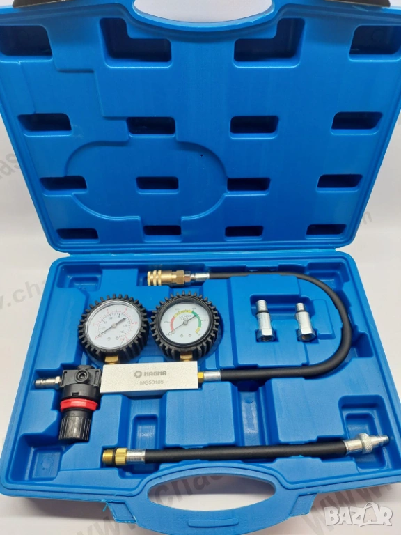 - манометър, манометър за течове в цилиндъра, адаптер за свещта, маркуч за бърза връзка и регулатор.