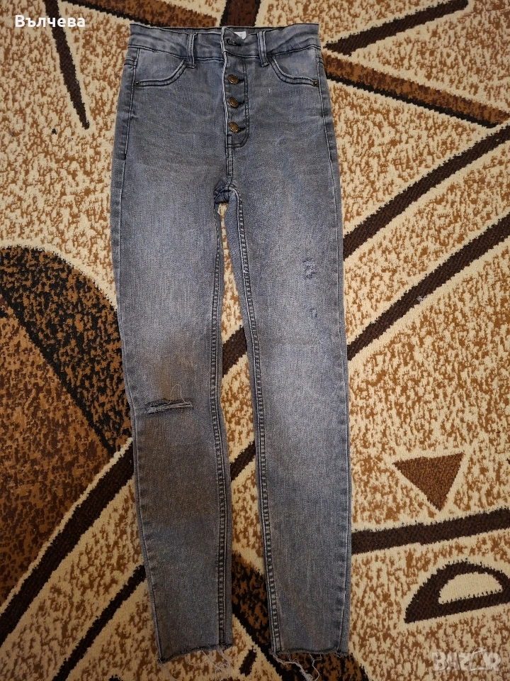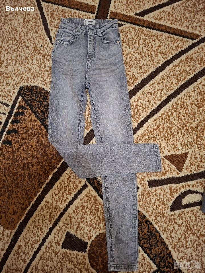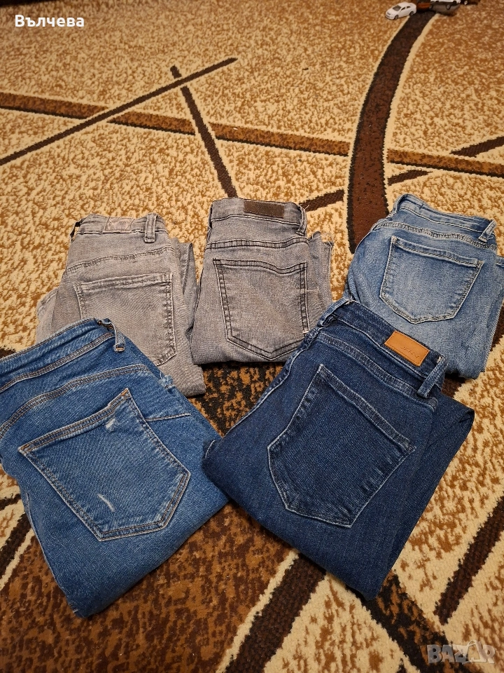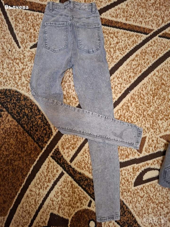 5 броя дънки в отлично състояние, размер ХС/С. Единият сив чифт има нещо,което прилича на петно,но не е, така съм ги купила.