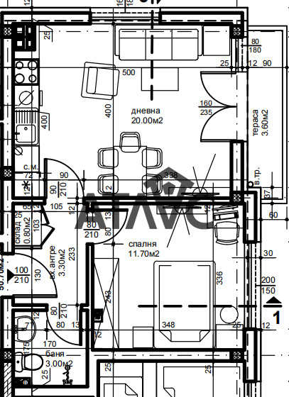 Жилището разполага с дневна с кухненско помещение, спалня, баня с тоалетна, входно антре, склад и тераса.
