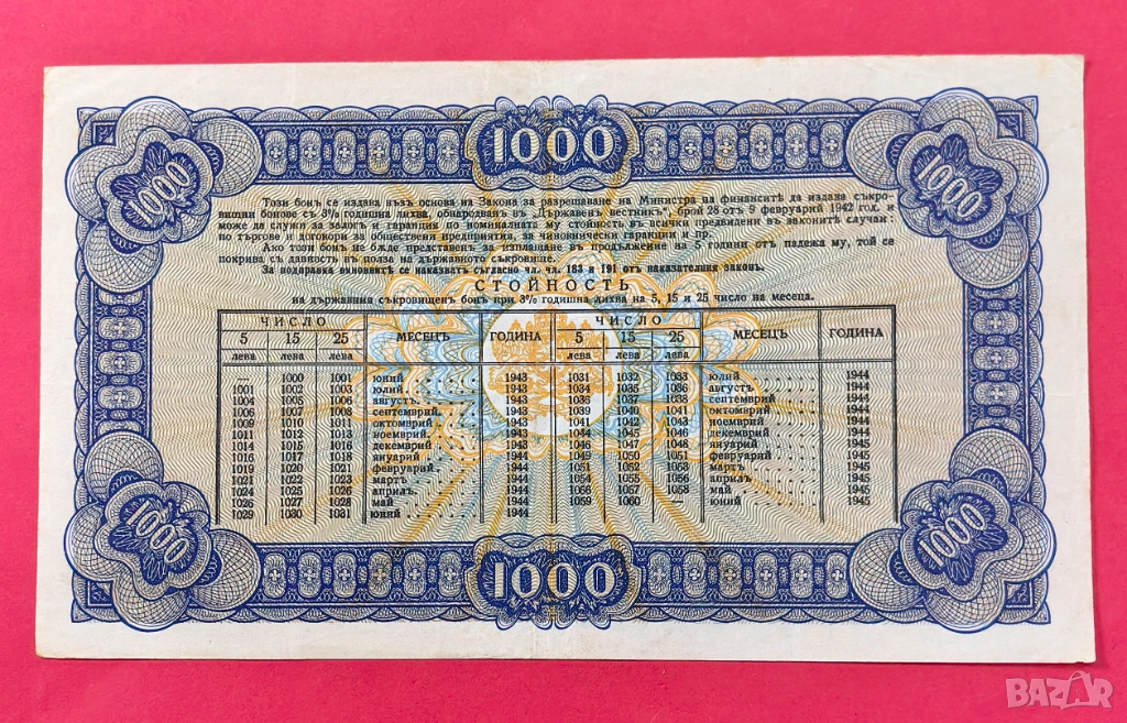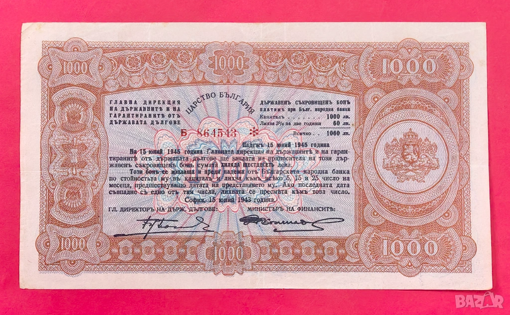 1000 лева 1943 Държавен Съкровищен бон → Обява 54030584