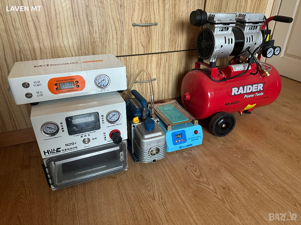 След закупуване на оборудването мога да предложа и кратко обучение, както и всички необходими настройки и тънкости за различните видове дисплеи при Андроид и iOS телефоните. Комплекта може да се вземе и без компресора(100€)
