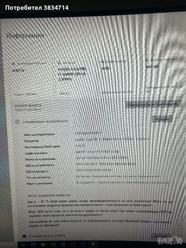 Геймърски компютър ASUS / Intel i5 / GTX 1650 → Обява 54031610