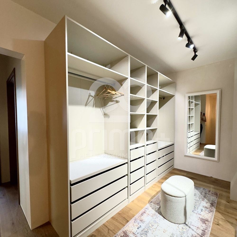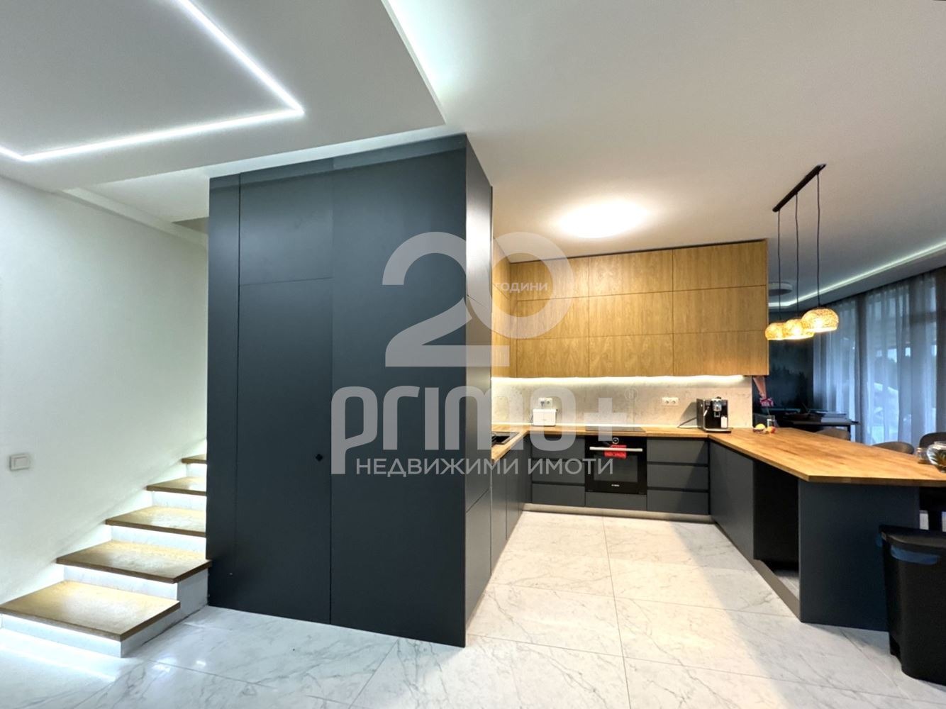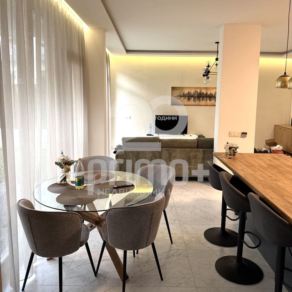 Имотът се отличава със съвременен интериор, високи тавани и големи френски прозорци, осигуряващи много естествена светлина. Интериорът е реализиран с внимание към детайла и функционалността. Обзавеждането е подбрано в най-висок клас, без компромис в качеството на материалите и електроуредите.