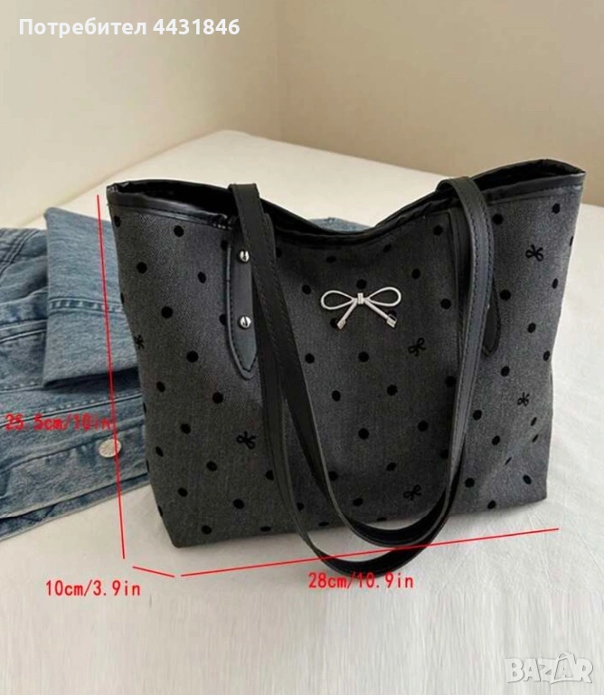 Стилна черна дамска чанта с изчистен и елегантен дизайн, украсена с фини точки и деликатна панделка отпред. Практична и удобна, с достатъчно пространство за ежедневните ти вещи – перфектният аксесоар както за ежедневието, така и за по-специални поводи.