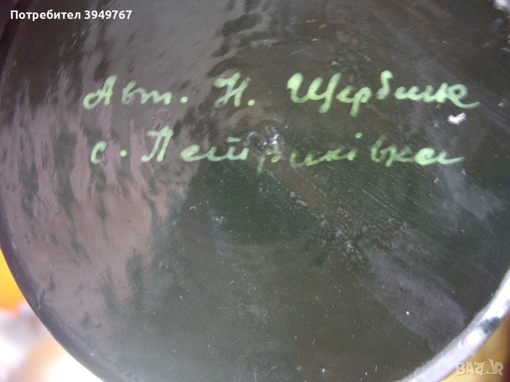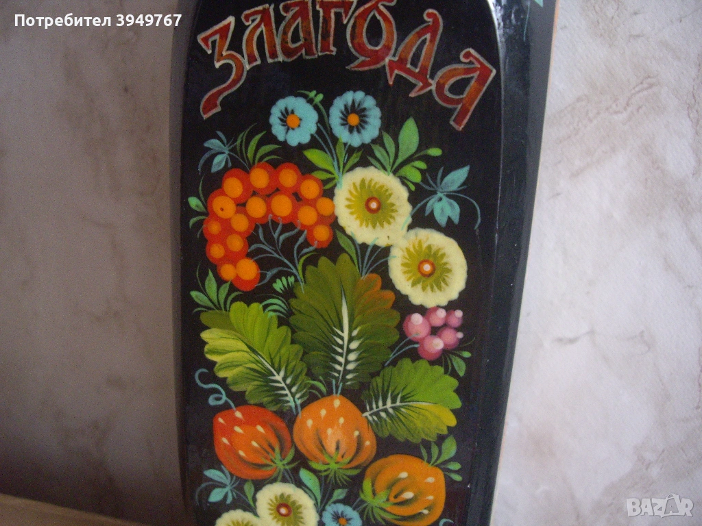 Празна стъклена бутилка облицована в ръчно рисувано дърво.На дъното има автора и населеното място.