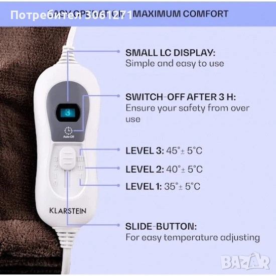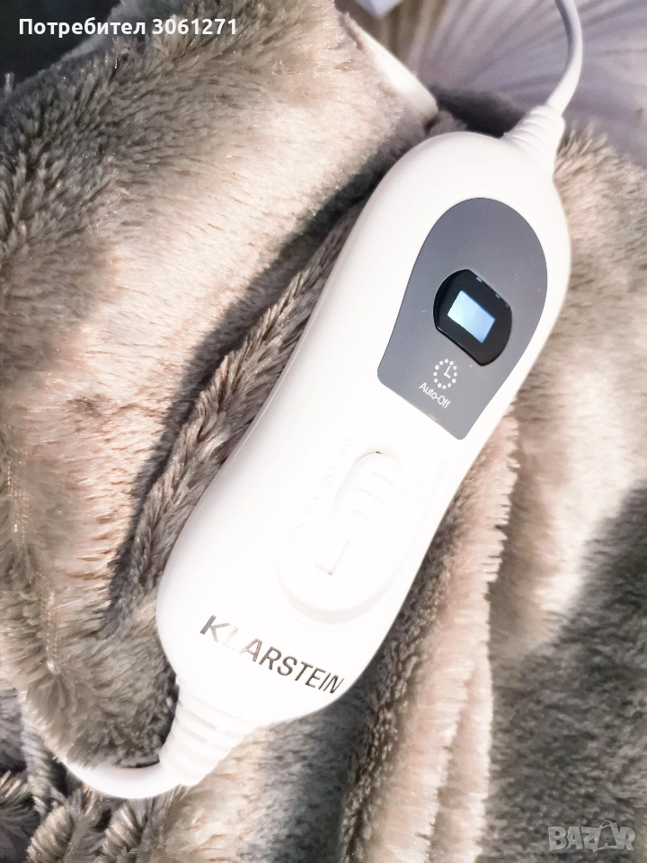 Немски Електрическо одеяло KLARSTEIN Sherlock XXL 180х130см Изборът на одеяло за загряване в леглото, гушкане на дивана или работа е ключов за комфорта. Топлина: Електрическото одеяло осигурява успокояващи температури на дивана или в леглото. Ако искате да се сгушите в топло и уютно легло вечер, особено през зимата, трябва да използвате електрическото одеяло Klarstein Dr. Watson. Микроплюш: Топлината на одеялото идва не само от чудесно мекия микроплюш, който се адаптира към тялото, но и благодарение на силната производителност, която може да се регулира според индивидуалните нужди от топлина с три различни нива. Функция таймер: За да можете да заспите спокойно или да продължите да спите необезпокоявани, без да се налага да ставате посред нощ, електрическото одеяло има функция таймер, с която одеялото се изключва напълно след 3 часа. Облекчаване на болката: Електрическото одеяло Klarstein Dr. Watson има и ползи за здравето. Особено за хора със слаба имунна система или при определени оплаквания като мускулни болки, болки в гърба или артрит, топлината може да бъде много успокояваща. Почистване: С размерите си е удобно двама души да се сгушат под термо одеялото. За да се осигури комфорт за дълго време, контролният панел може да се сваля и одеялото може лесно да се пере в пералня. Eлектрическо одеяло от микрофибър с мощност 120 W - Сменяем контролен панел с три нива на мощност и автоматично изключване след три часа. - Големи размери 180 х 130 см за най-висок комфорт. - Подвижна секция за управление (изключване, стъпка 1/2/3) - Осветен дисплей - Повърхност от микрофибър - Подходящо за пералня (30 ° C, програма за вълни) - Автоматично изключване след три часа - Захранване: приблизително 2 м кабел - Захранване: 220-240V ~ 50 / 60Hz Нов без забележки. Тегло 2кг Много пухкава одеялото Нова цена беше 75,-евро