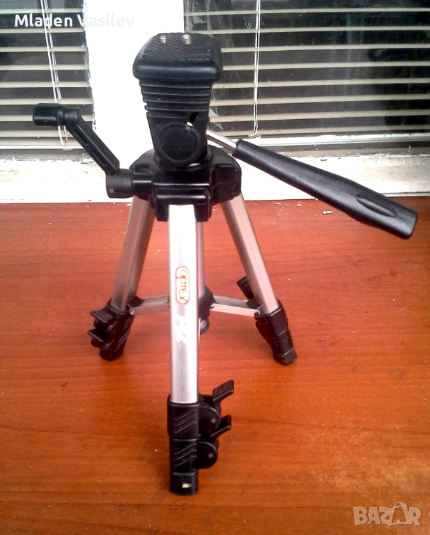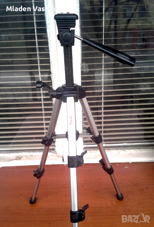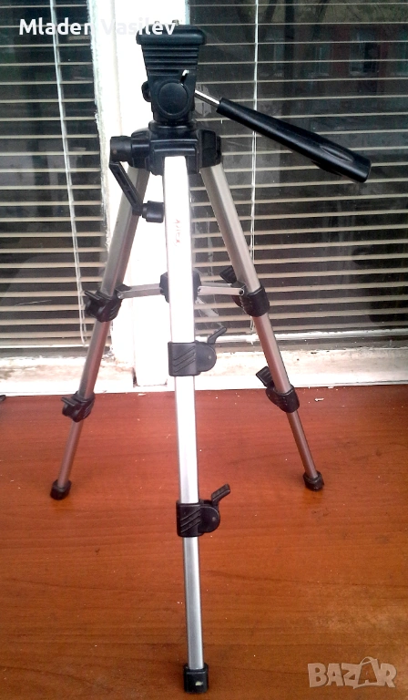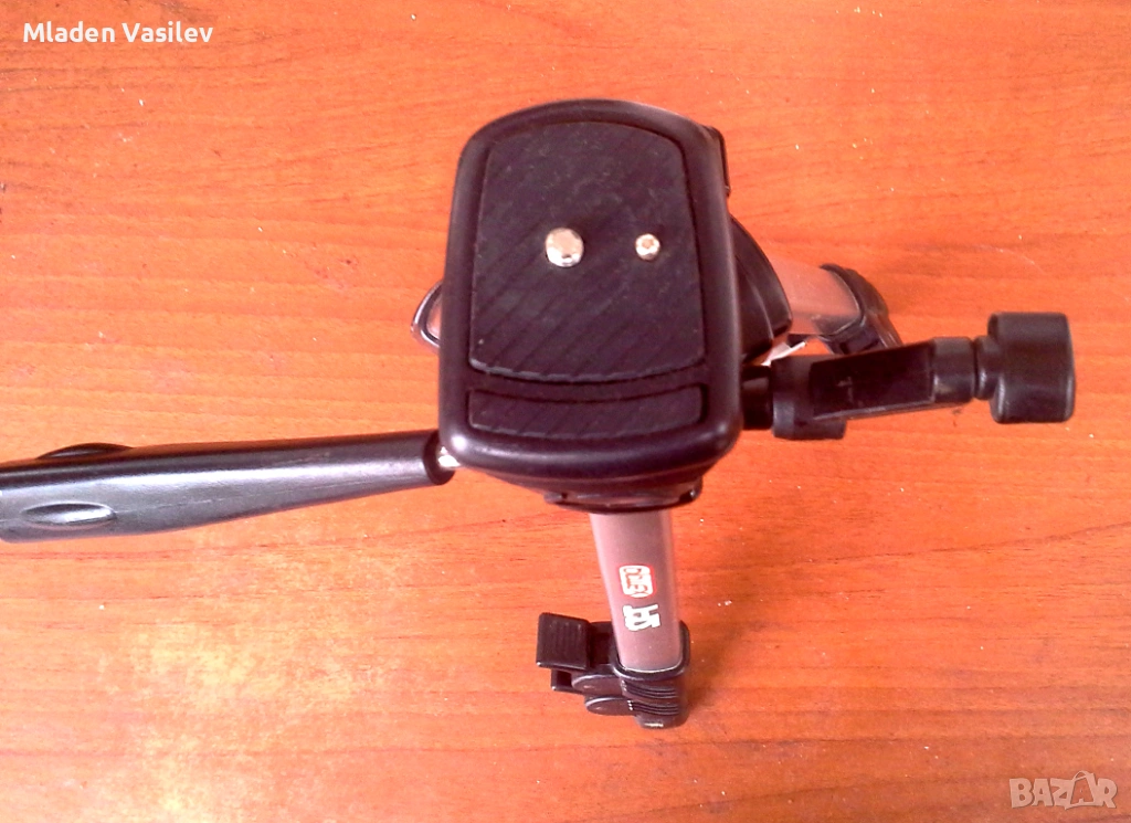 Мини статив подходящ за предметна фотография, макро фотография. Алуминиеви крака. Лек и компактен. Размери: сгънат - 30см, разпънати трите сегмента на краката - 50см и с разпъната колона - 60см. Закупен в САЩ за 50$. Много леки следи от употреба, добро състояние.
