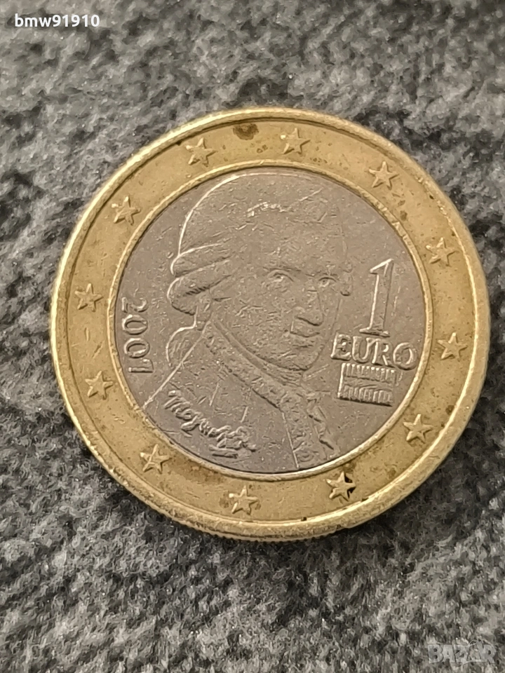 Това е австрийска монета от 1 евро, емитирана през 2007 година. Дизайн: Изобразява портрет на известния австрийски композитор Волфганг Амадеус Моцарт.