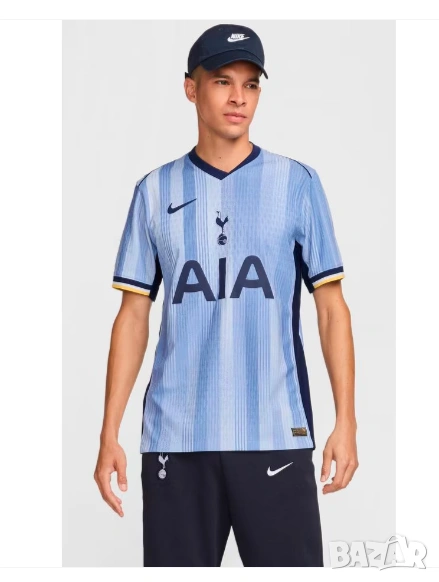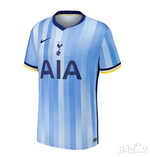 Екипът на Тотнъм за гостуващия сезон 2024-25 е в небесносиньо като основен цвят, а стилизираният райет мотив напомня за ерата на Le Coq Sportif и Hummel от 80-те години на миналия век. Гербът е разположен в центъра на гърдите, а емблематичният сууш на Nike остава на обичайното си място. За да завършат екипа, маншетите на ръкавите са в тъмносиньо, жълто и бяло, докато яката е в тъмносиньо
