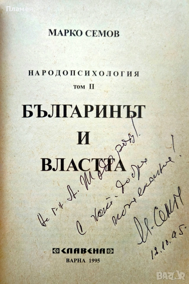 Марко Семов - Народопсихология. Том 2: Българинът и властта -издание 1995г. с посвещение и автограф от автора в 381 страници -17 евро.