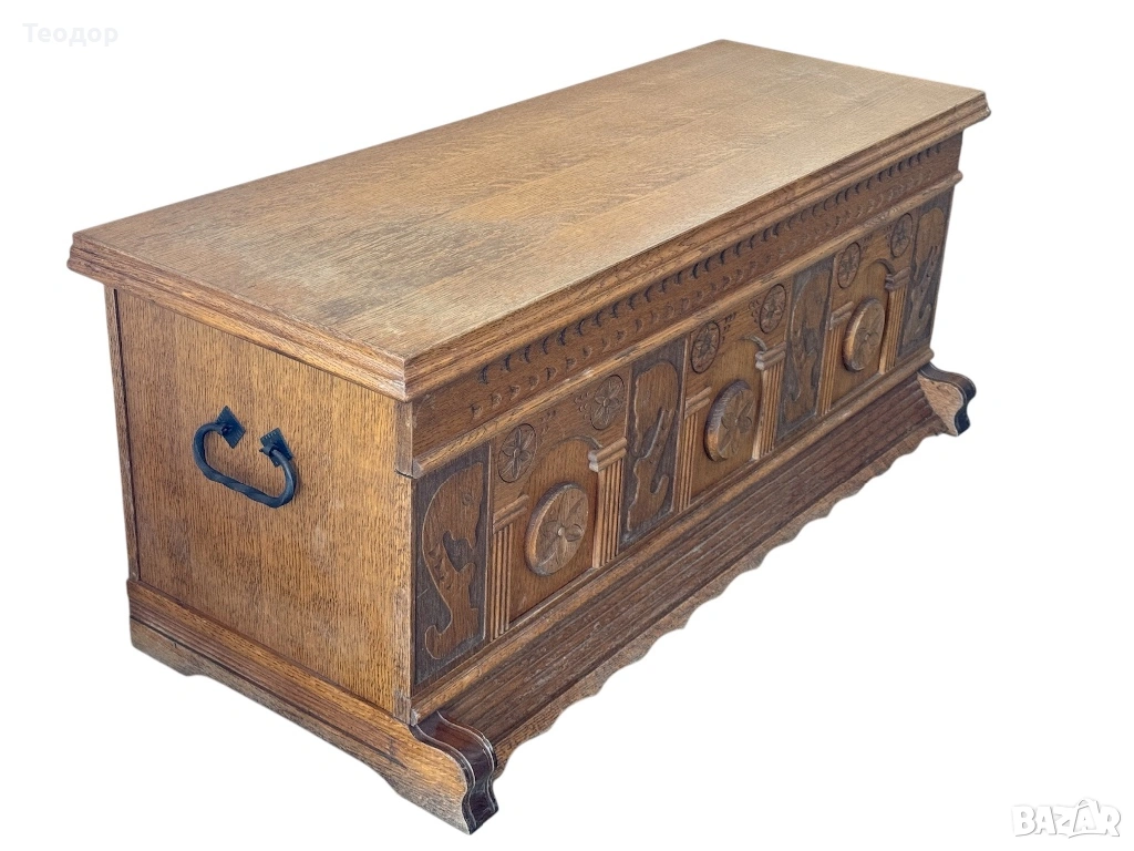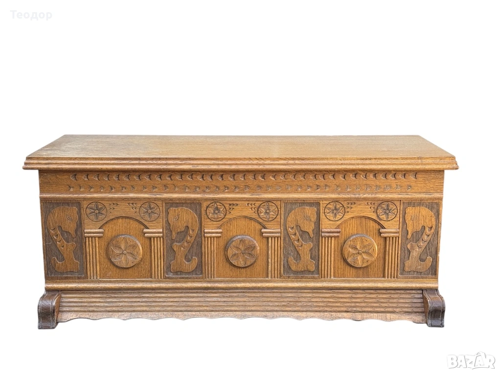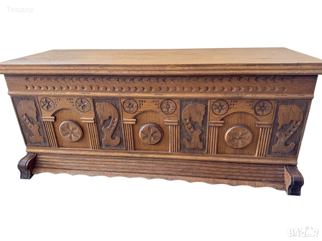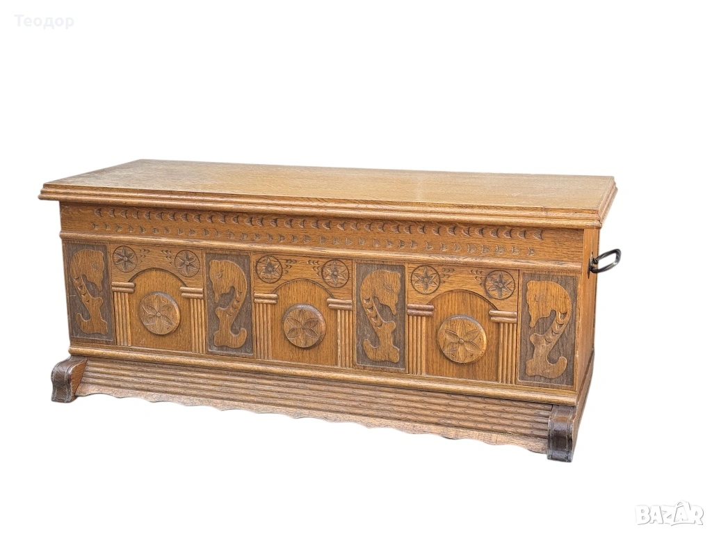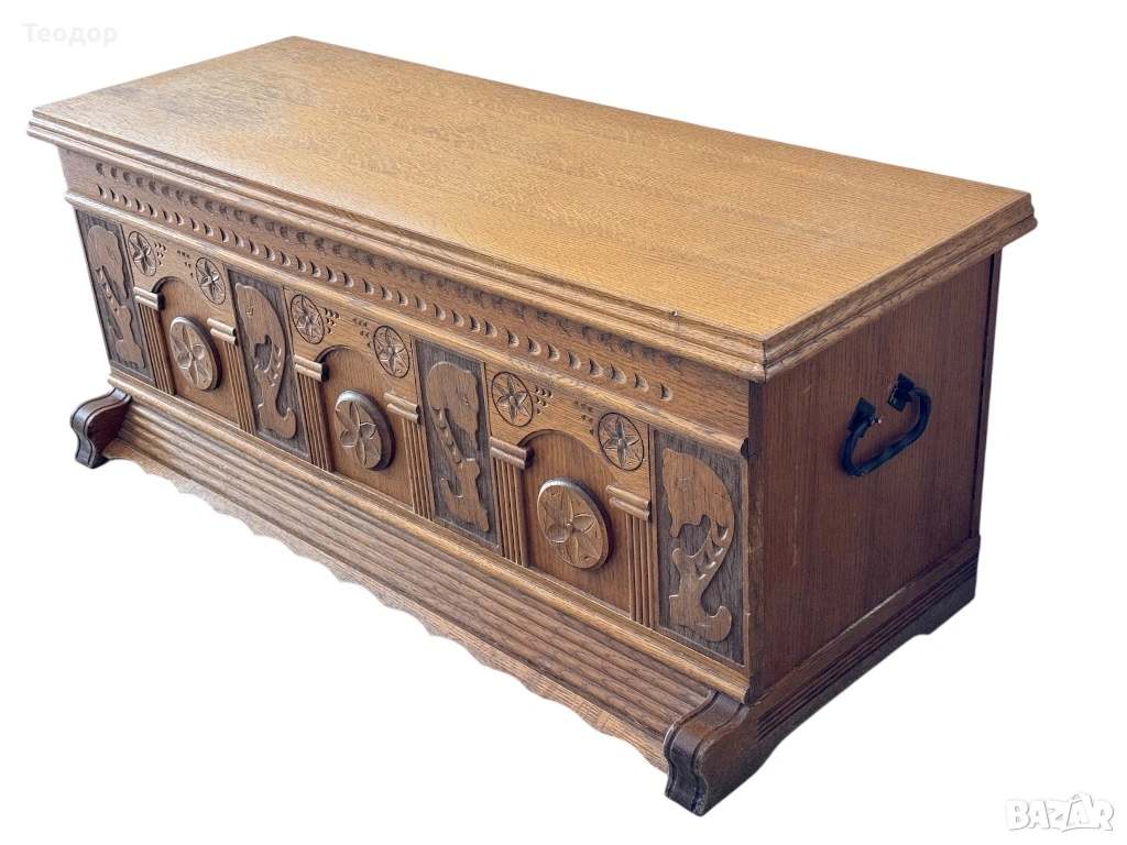 Предлагам старинен ръчно изработен дървен сандък, датиращ от средата на XX век (около 1950–1960 г.), с изключително красива и детайлна дърворезба. Подобни мебели са били характерни за домовете преди и са използвани за съхранение на ценни вещи, дрехи и чеиз.