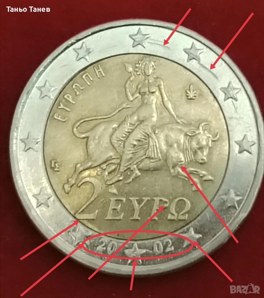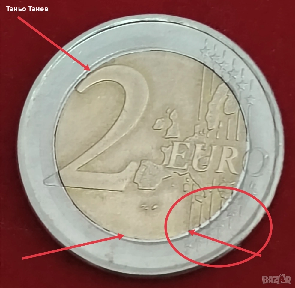 Една изключително рядка монета от 2Евро -2002г със символ (S) и множество дефекти → Обява 54033613