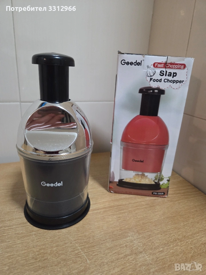 Ръчен чопър за зеленчуци Geedel Fast Chopping Slap Food Chopper, модел PS-358A. Тип: Ръчен чопър с натискане (тип "slap"). Употреба: Подходящ за бързо рязане на зеленчуци, лук, чесън, ядки и плодове. Дизайн: Компактен размер, лесен за почистване и съхранение. Функционалност: Разполага с остриета, които се въртят при натискане на горната част.