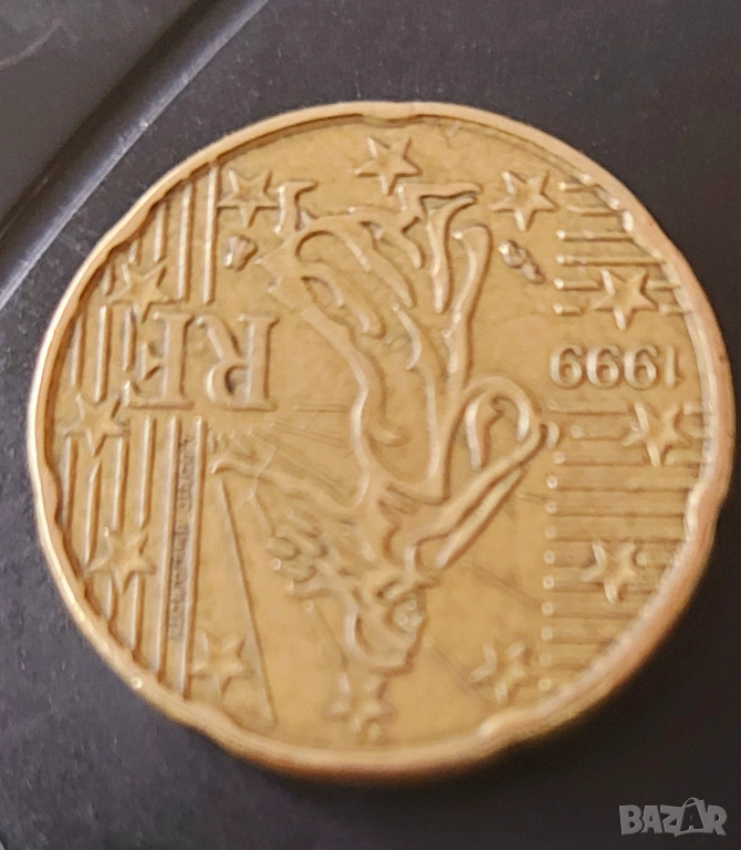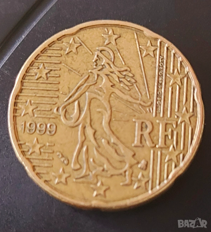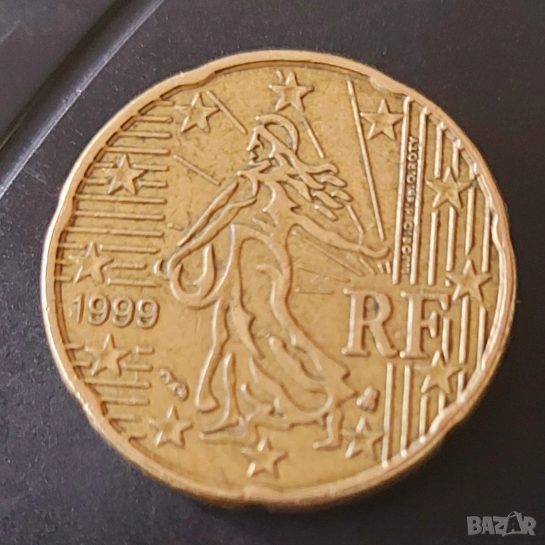 Стандартна монета от 20 евроцента от Франция, сечена през 1999 г. (с обозначение "RF")
