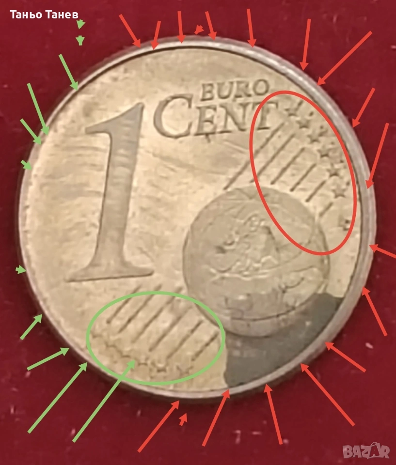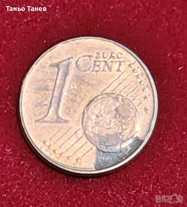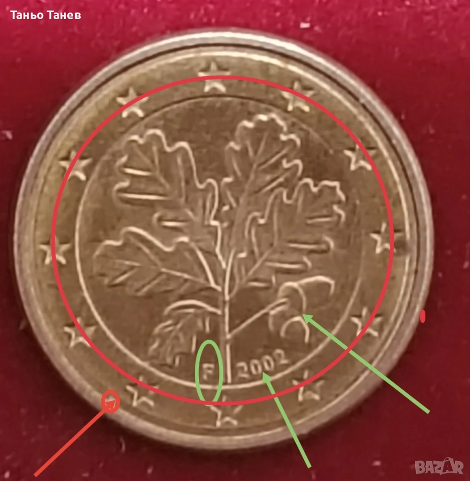 Една изключителна Немска монета от 1Евро цент- 2002г със инициала (F) и Дефекти при изсичането на монетата който са видими на Снимките.Дизаин -Дъбова клонка. Автор -(Ролф Ледербоген)