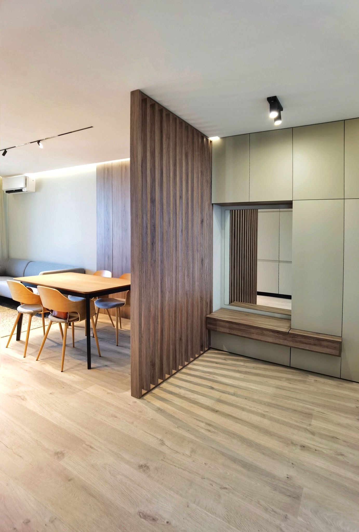 Имотът е с площ от 80 кв.м и се намира на първи етаж. Разпределението включва обособено входно антре, просторна всекидневна с отделена кухненска част, две комфортни спални, две напълно оборудвани бани с тоалетни и душ кабини, тераса. Едната спалня разполага със собствена баня, осигуряваща допълнително удобство и уединение.