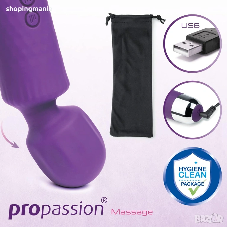 • Масажен стик Propassion е толкова индивидуален, колкото са вашите изисквания и желания. С 20 интензивни режима на вибрация и 8 нива на интензивност, можете да изпитате лична релаксация.