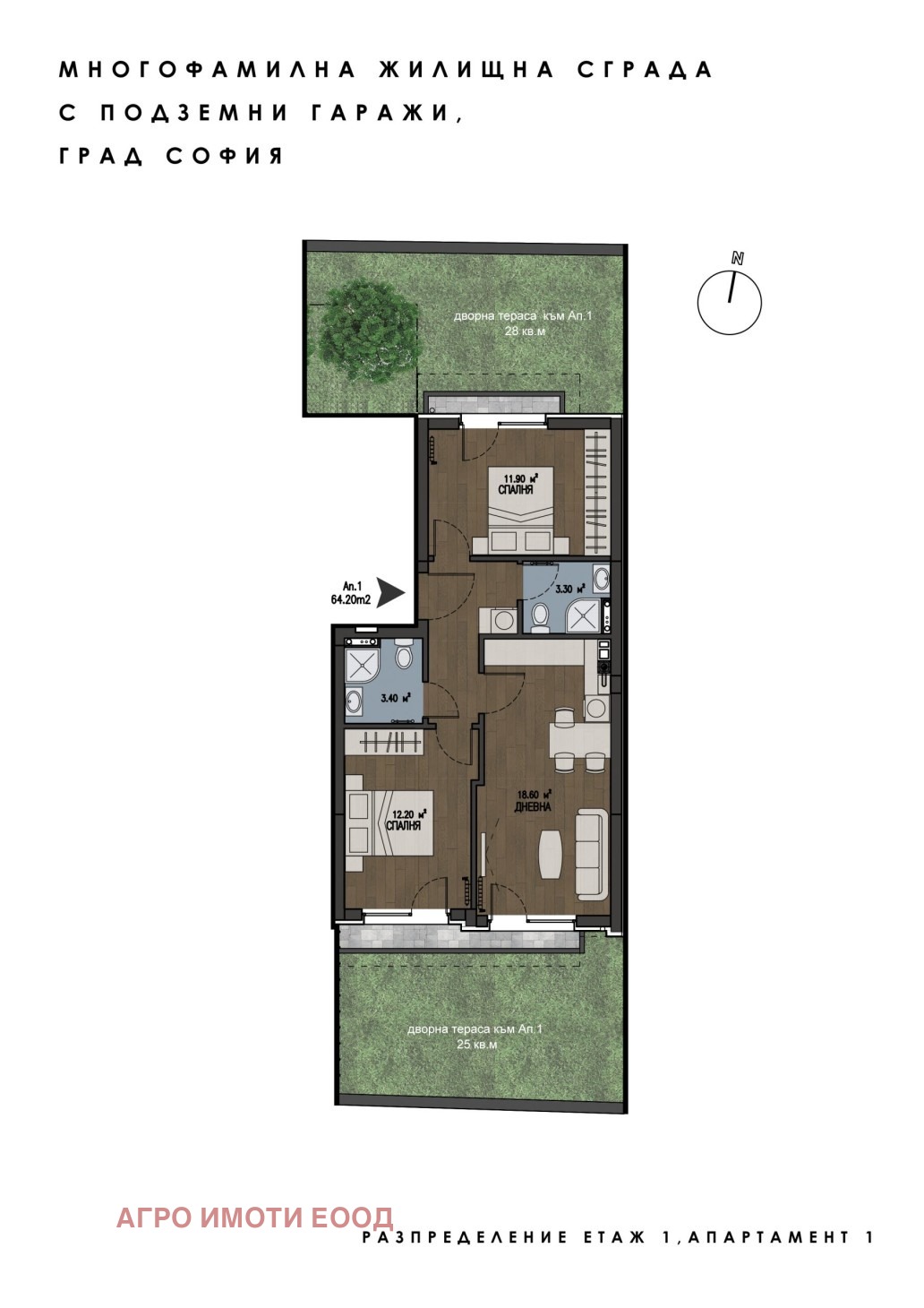 АПАРТАМЕНТ 1 /едно/, на първи етаж, разположен на кота +0,00 /плюс минус нула цяло и нула стотни/ метра, със застроена площ от 64,20 /шестдесет и четири цяло и двадесет стотни/ кв.м., състоящ се от: антре, коридор, две спални, дневна с кухненски бокс, две бани с тоалетни и две тераси, заедно с 6,06% /шест цяло и шест стотни върху сто/ идеални части, съответстващи на 10,18 /десет цяло и осемнадесет стотни/ кв.м. от общите части на сградата, заедно със съответните идеални части от правото на строеж върху поземления имот. Към апартамента се включва и дворна тераса с площ от 53,00 /петдесет и три/ кв. м., представляваща вътрешен двор, прилежаща към АПАРТАМЕНТ 1 (едно), на първи етаж.
