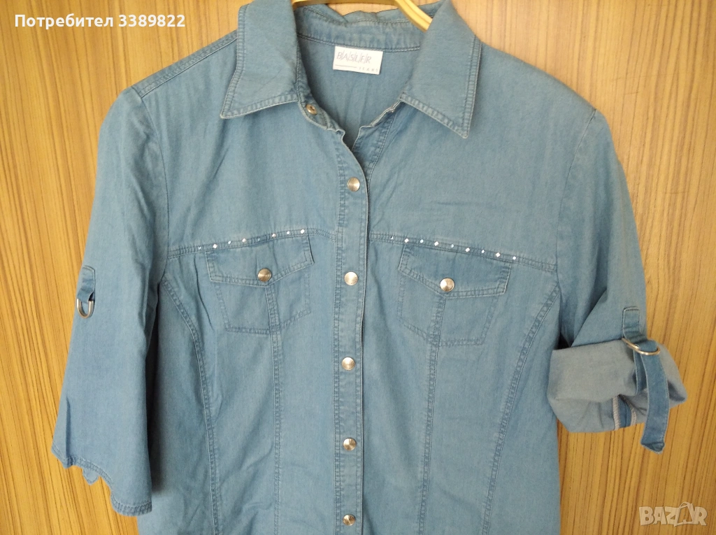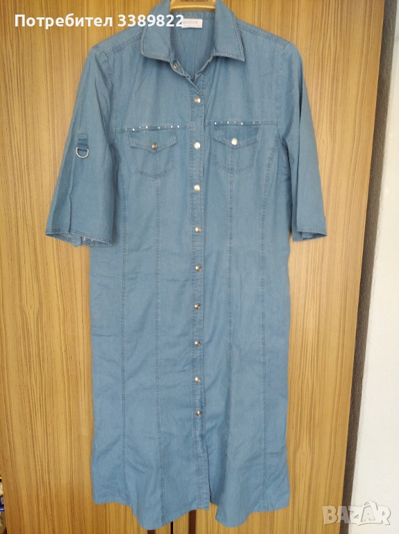 Продавам дънкова рокля - мек плат, отпред се закопчава с копчета, има яка, два странични джоба, два джоба имитация, 3/4 ръкав, който може да се регулира с тока и лентичка, дължина от рамото до долу 112см, гръдна обиколка едностранно 53см, размер L.