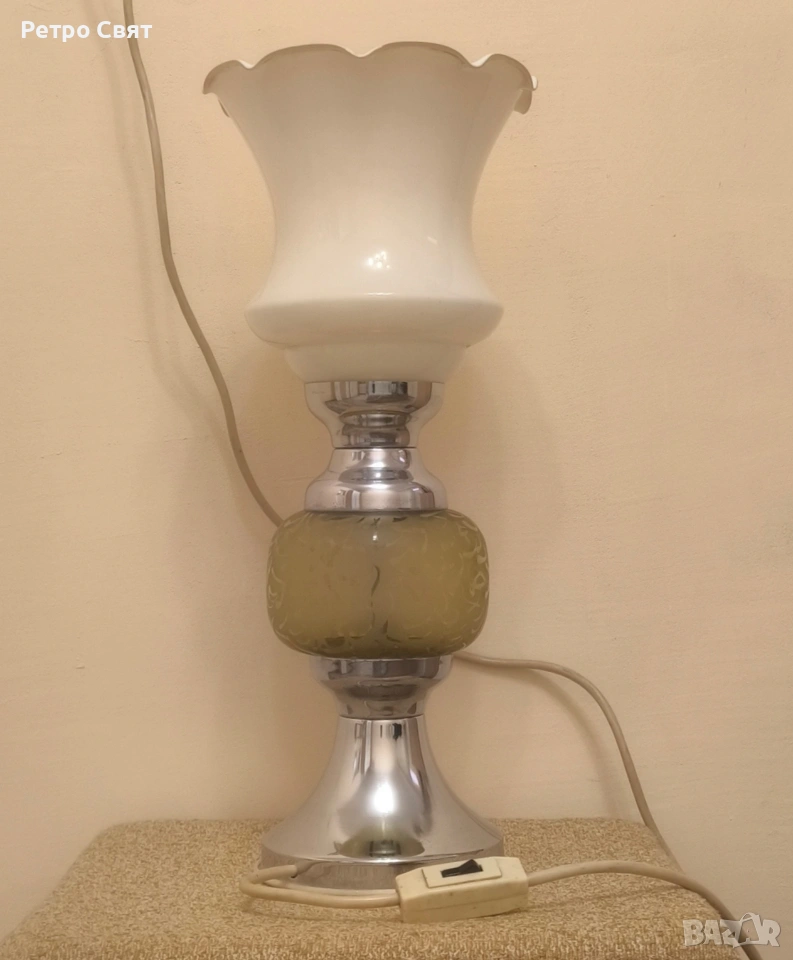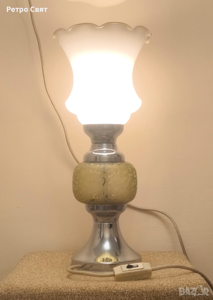 Голяма ретро настолна лампа от миналия век. Настолна лампа за хол. Корпус от качествен метал и тънкостенно закалено зелено стъкло. Изключително стабилна. Фасунга с цокъл Е 27. Изправна и в много добро състояние за годините си. Височина на корпуса-31cm. Обща височина с стъкления абажур-50cm. Опаковам за моя сметка. Цената е крайна!