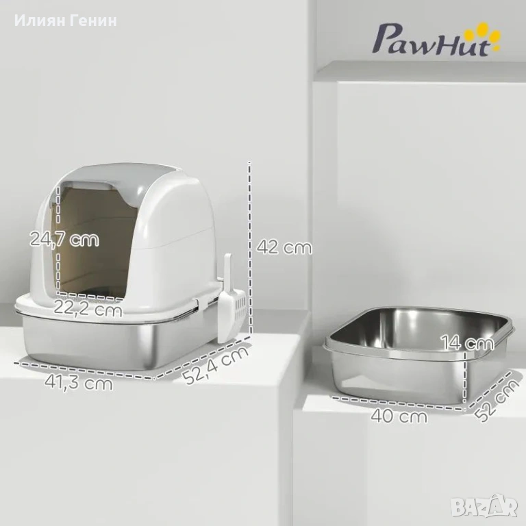 PawHut Котешка тоалетна от неръждаема стомана с капак, Котешка тоалетна с табла, Лъжичка за тоалетна, за котки под 5 кг, 52,4 x 41,3 x 42 см, Бяла - 50.00 €.