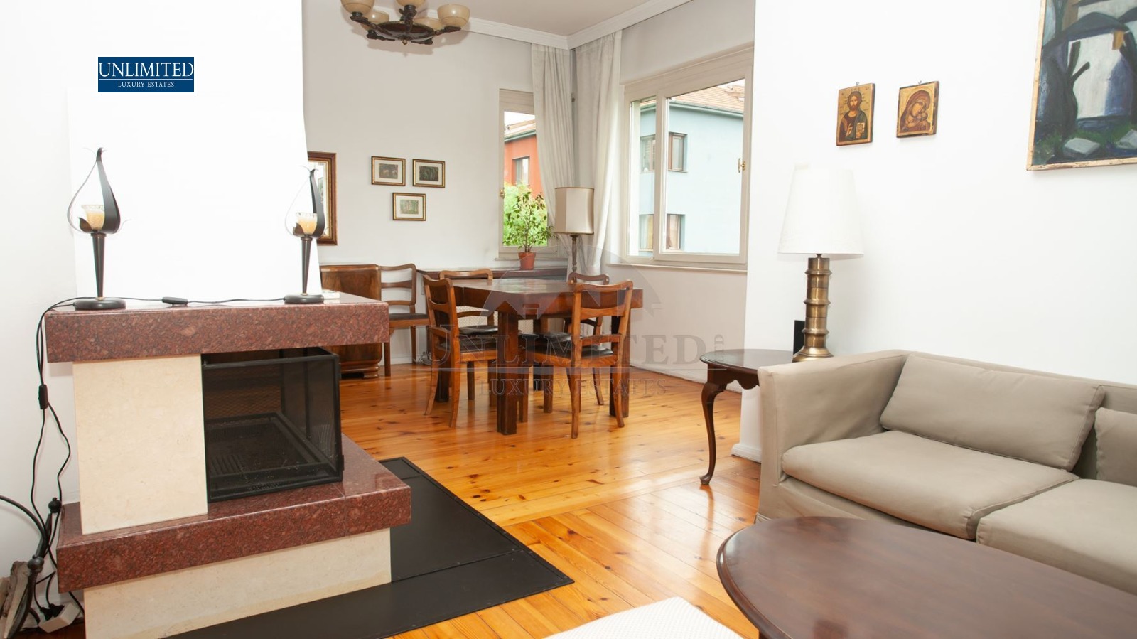 Жилището впечатлява с високи тавани, естествен масивен паркет и усещане за простор и уют, допълнени от автентични интериорни елементи и камина, създаващи топла и аристократична атмосфера.