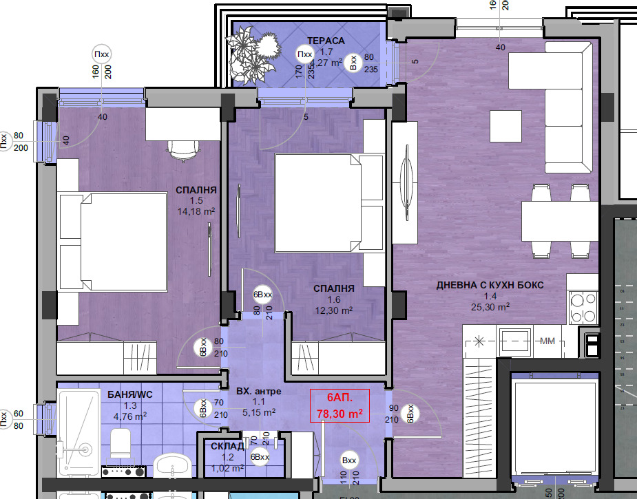 Имотът е ситуиран на 2-ри етаж и разполага с площ от 87 кв.м., разгърната по следния практичен начин: Входно антре, дневна с кухненски бокс, две спални, баня с тоалетна, склад, тераса.