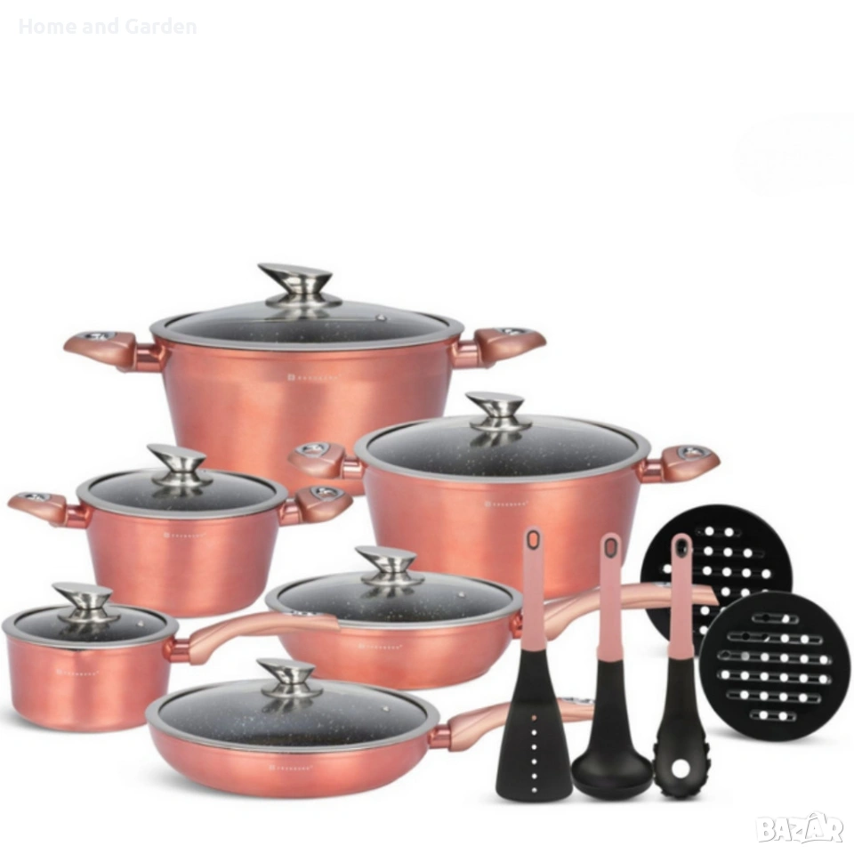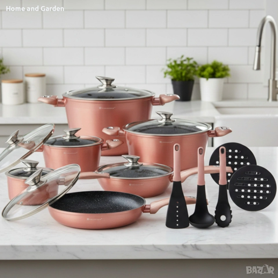 Комплект: 15 части (тенджери, тигани, капаци, 3 кухненски прибора, 2 бакелитни подложки)