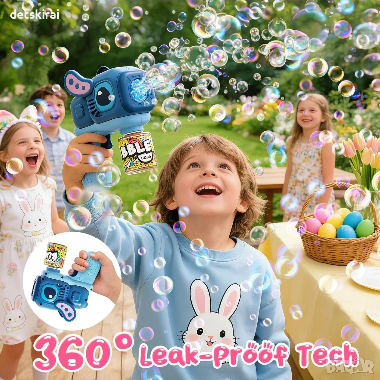 Изработен от безопасни и нетоксични материали, продуктът е напълно подходящ за деца и осигурява спокойствие за родителите. Комплектът включва пистолет за балончета и бутилка с течност, така че играта може да започне веднага.