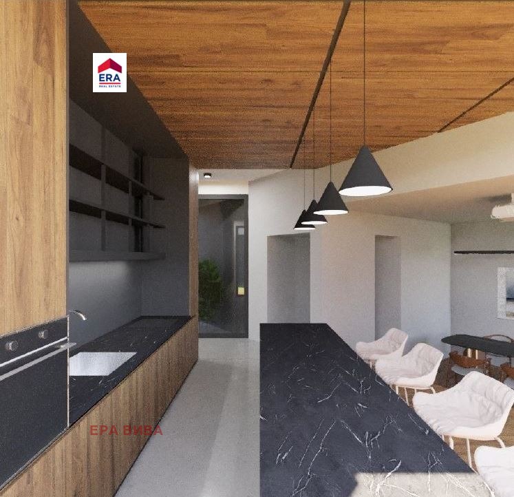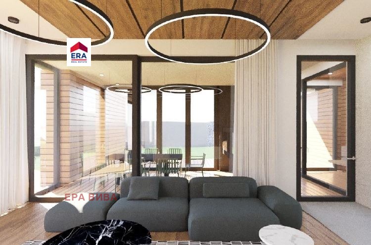 Имотът впечатлява не само със своята модерна и разчупена визия, но и с функционално разпределение и просторни помещения. Имотът се състои на партерен етаж от преддверие, просторен двоен гараж с възможност за паркиране на четири автомобила, стълбище, винарна за ценителите на доброто вино, фитнес помещение за вашето удобство и активен начин на живот, баня с тоалетна и техническо помещение. На първи етаж се състои от преддверие, просторна дневна с кухня и трапезария, спалня, баня с тоалетна, отделна тоалетна, килер, стълбище, сауна, зимна градина с камина и тераса, идеална за поставяне на джакузи. На втори етаж се състои от преддверие, спалня с баня и тоалетна, гардеробно помещение, коридор, две спални с общ дрешник, стълбище, баня с тоалетна, спалня и балкон. Отоплението на къщата е решено чрез термопомпа и подово отопление с конвектори, като е предвидена и климатизация за комфортен престой през топлите месеци. Къщата се предлага в степен на завършеност на шпакловка и замазка, а дворът ще бъде с ландшафтно осветление, поливна система и напълно озеленен. За къщата е изготвен впечатляващ идеен интериорен проект, който позволява лесно да си представите уютно и стилно обзаведено пространство.