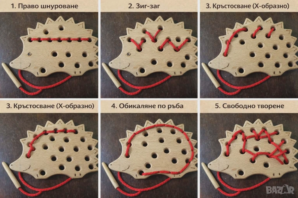 Как се използва: детето взема червеното въженце с дървената "игла", промушва го през дупките и прави различни шарки или "ушива" фигурка.