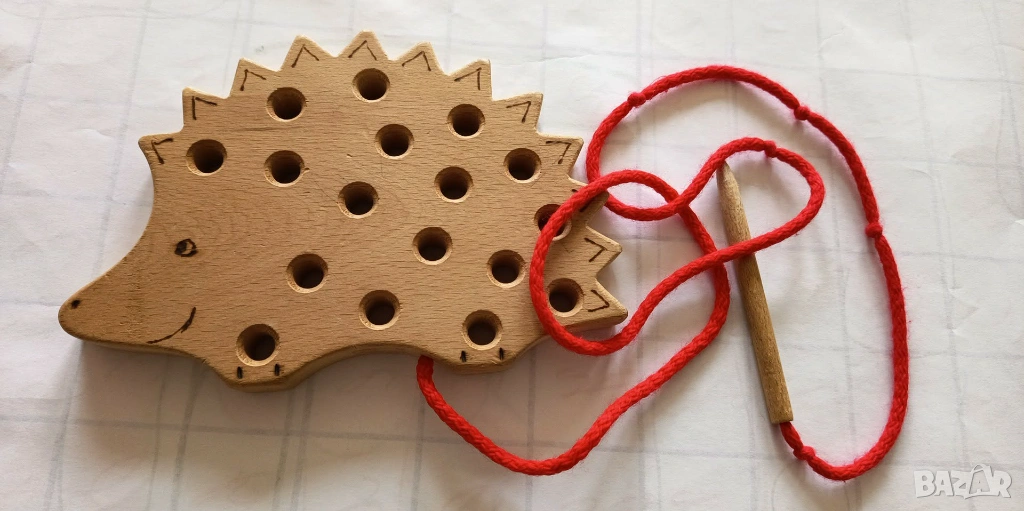 Дървена образователна играчка за шнуроване във форма на таралеж. Играчката е в много добро, почти отлично състояние. Подходяща е за развиване на фината моторика, координацията око-ръка и концентрация по забавен начин.